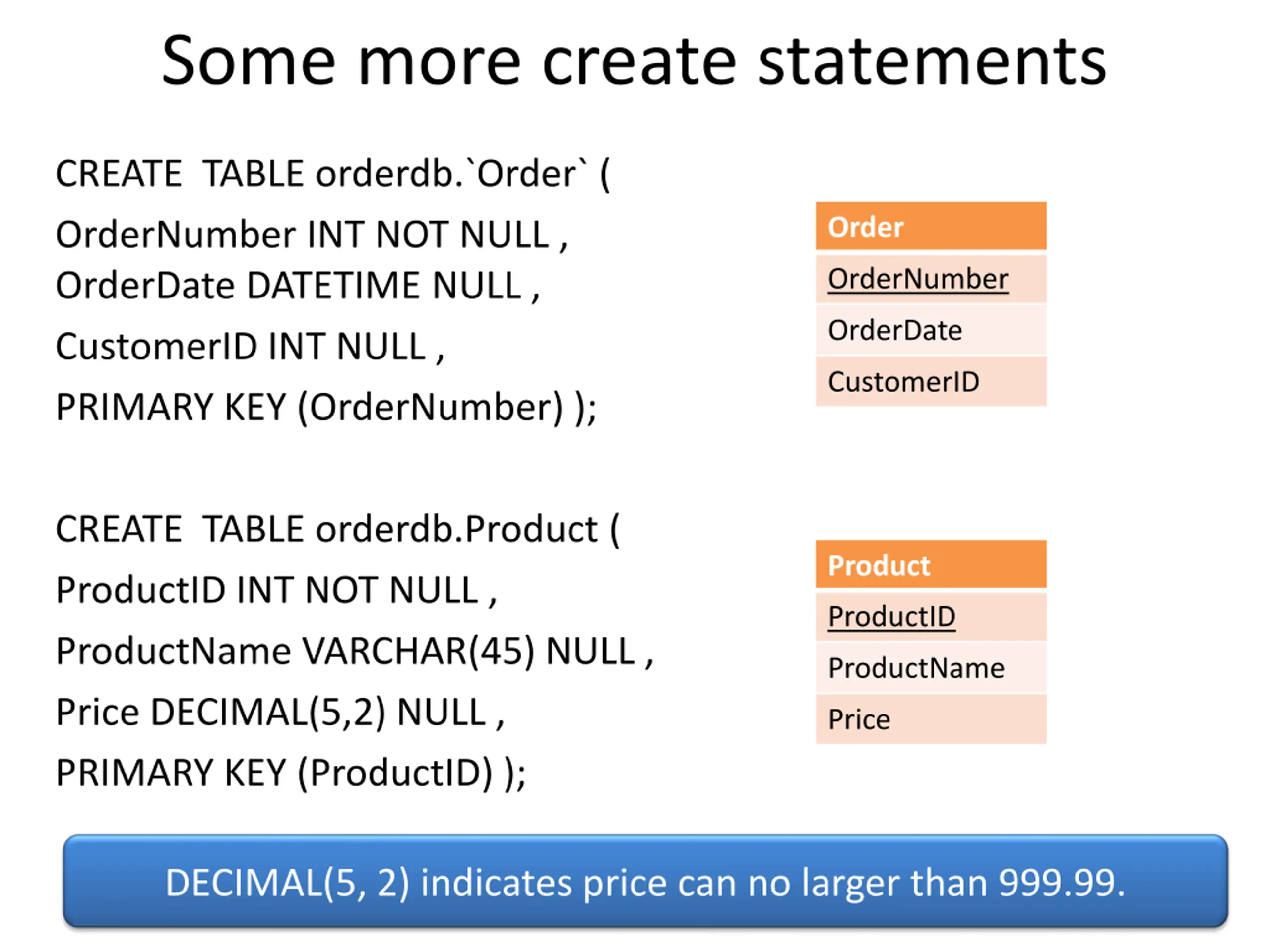 Some more create statements CREATE TABLE orderdb.`Order` ( OrderNumber INT NOT NULL , OrderDate DATETIME NULL , CustomerID INT NULL , PRIMARY KEY (OrderNumber) ); Order OrderNumber OrderDate CustomerID CREATE TABLE orderdb.Product ( ProductID INT NOT NULL , ProductName VARCHAR(45) NULL , Price DECIMAL(5,2) NULL , PRIMARY KEY (ProductID) ); Product ProductID ProductName Price DECIMAL(5, 2) indicates price can no larger than 999.99.