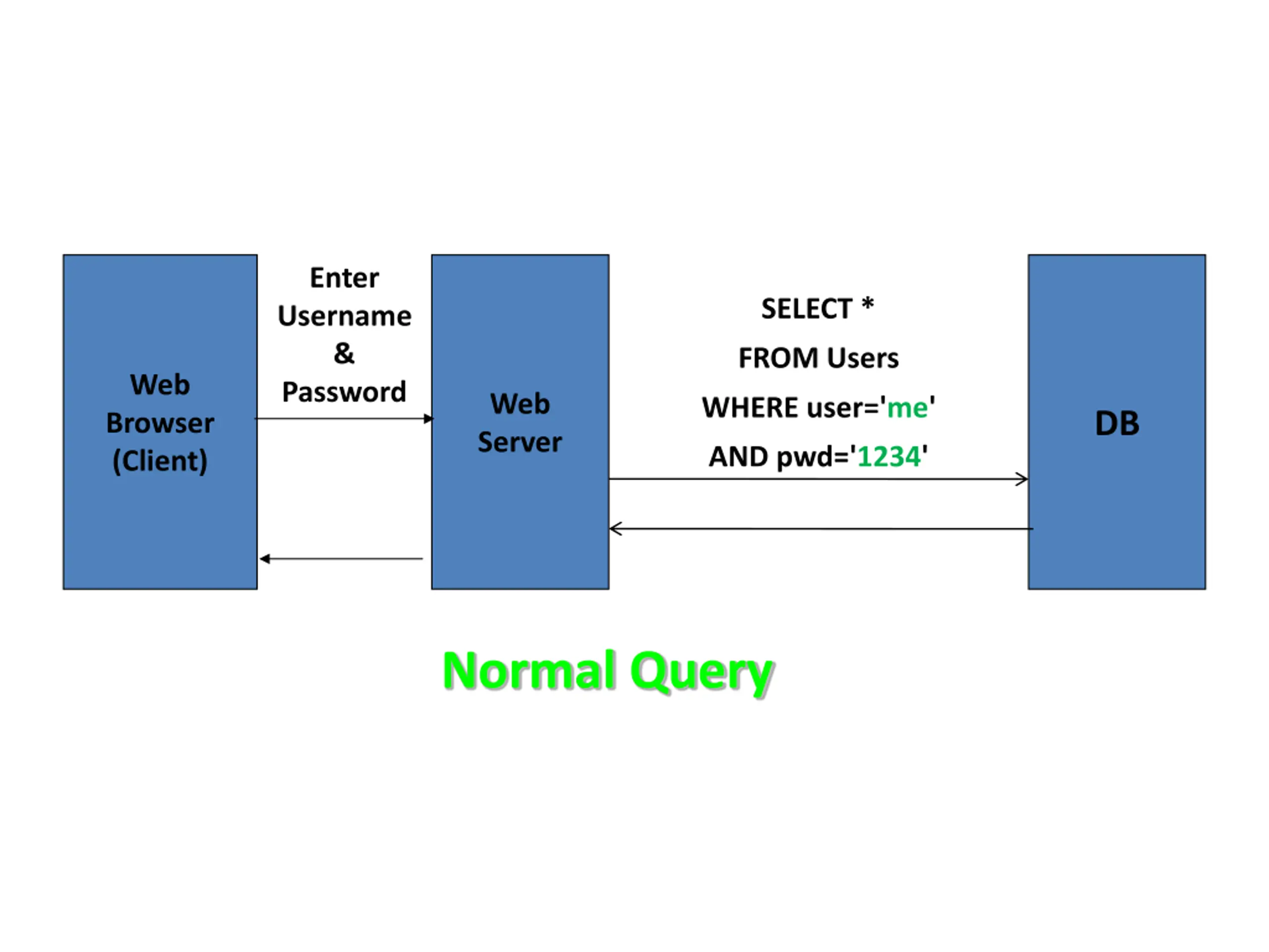 Enter Username & Password SELECT * FROM Users Web Browser (Client) Web Server WHERE user='me' DB AND pwd='1234' Normal Query