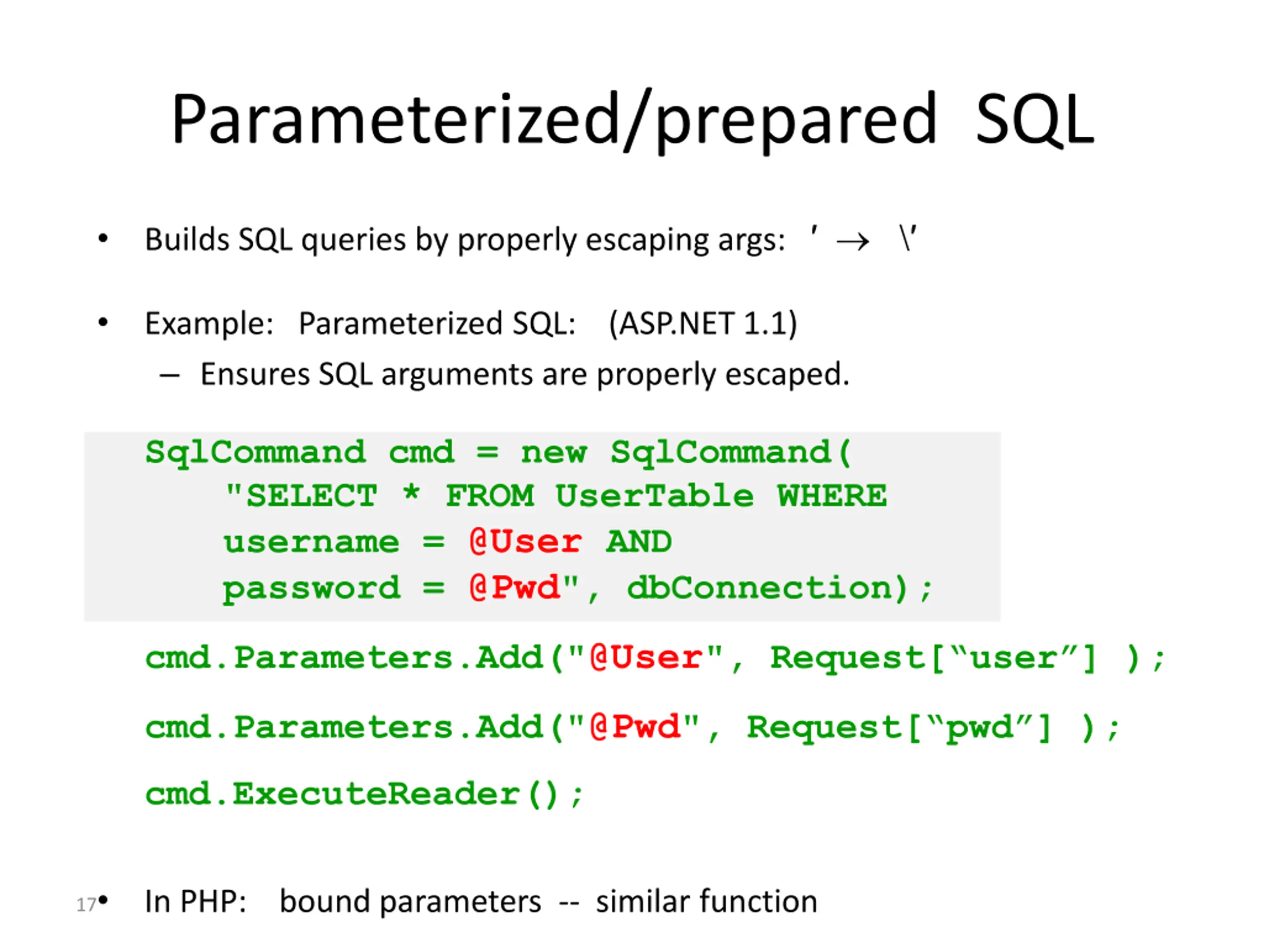 Parameterized/prepared SQL Builds SQL queries by properly escaping args: \ Example: Parameterized SQL: (ASP.NET 1.1) Ensures SQL arguments are properly escaped. SqlCommand cmd = new SqlCommand( "SELECT * FROM UserTable WHERE username = @User AND password = @Pwd", dbConnection); cmd.Parameters.Add("@User", Request[ user ] ); cmd.Parameters.Add("@Pwd", Request[ pwd ] ); cmd.ExecuteReader(); In PHP: bound parameters -- similar function 17