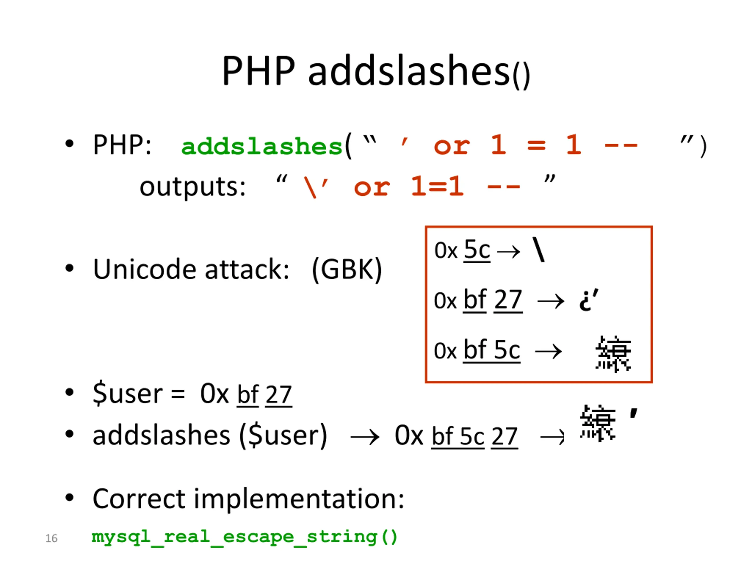 PHP addslashes() PHP: addslashes( or 1 = 1 -- ) outputs: \ or 1=1 -- 0x 5c \ Unicode attack: (GBK) 0x bf 27 0x bf 5c $user = 0x bf 27 addslashes ($user) 0x bf 5c 27 Correct implementation: mysql_real_escape_string() 16