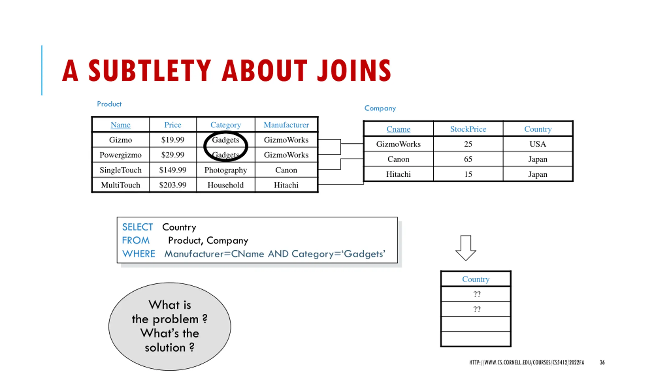 A SUBTLETY ABOUT JOINS Product Company Name Price Category Manufacturer Cname StockPrice Country Gizmo $19.99 Gadgets GizmoWorks GizmoWorks 25 USA Powergizmo $29.99 Gadgets GizmoWorks Canon 65 Japan SingleTouch $149.99 Photography Canon Hitachi 15 Japan MultiTouch $203.99 Household Hitachi SELECT Country FROM Product, Company WHERE Manufacturer=CName AND Category= Gadgets Country ?? What is the problem ? What s the solution ? ?? HTTP://WWW.CS.CORNELL.EDU/COURSES/CS5412/2022FA 36