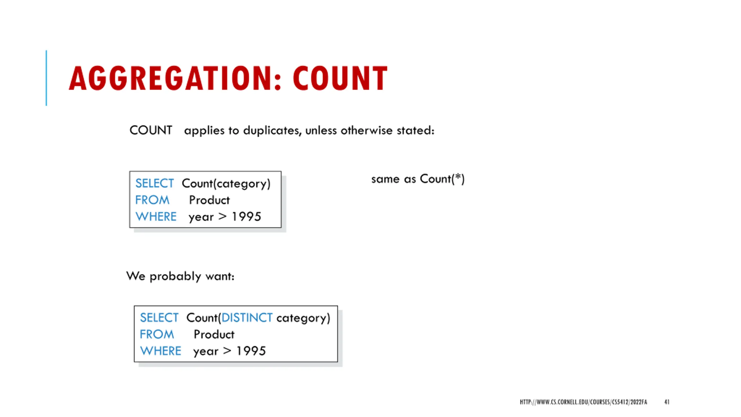 AGGREGATION: COUNT COUNT applies to duplicates, unless otherwise stated: same as Count(*) SELECT Count(category) FROM Product WHERE year > 1995 We probably want: SELECT Count(DISTINCT category) FROM Product WHERE year > 1995 HTTP://WWW.CS.CORNELL.EDU/COURSES/CS5412/2022FA 41