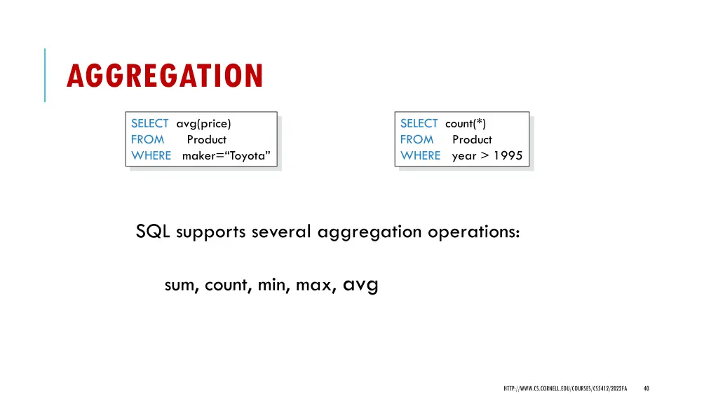 AGGREGATION SELECT avg(price) FROM Product WHERE maker= Toyota SELECT count(*) FROM Product WHERE year > 1995 SQL supports several aggregation operations: sum, count, min, max, avg HTTP://WWW.CS.CORNELL.EDU/COURSES/CS5412/2022FA 40