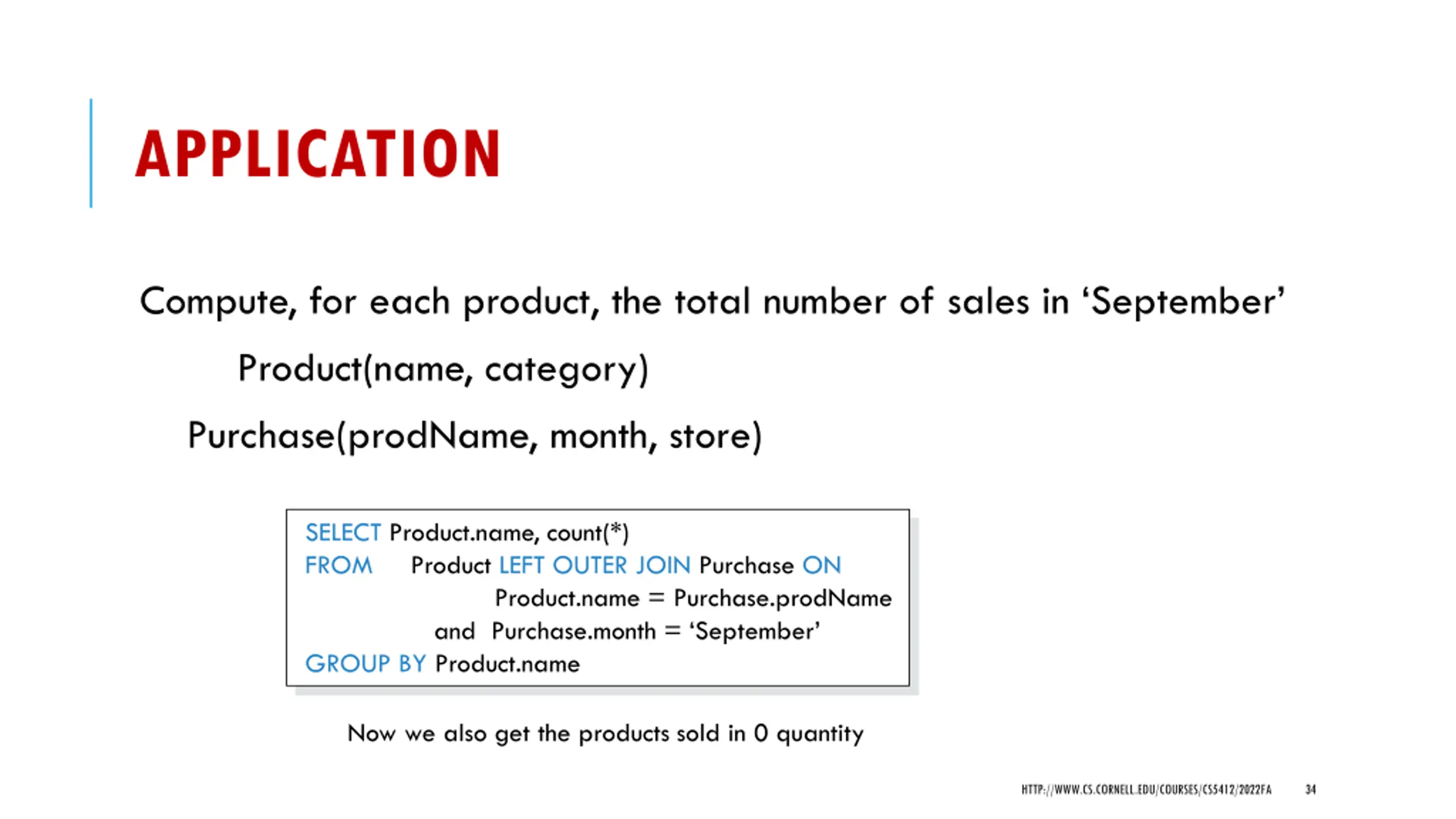 APPLICATION Compute, for each product, the total number of sales in September Product(name, category) Purchase(prodName, month, store) SELECT Product.name, count(*) FROM Product, Purchase WHERE Product.name = Purchase.prodName and Purchase.month = September GROUP BY Product.name no sales? Not listed! What s wrong ? HTTP://WWW.CS.CORNELL.EDU/COURSES/CS5412/2022FA 33