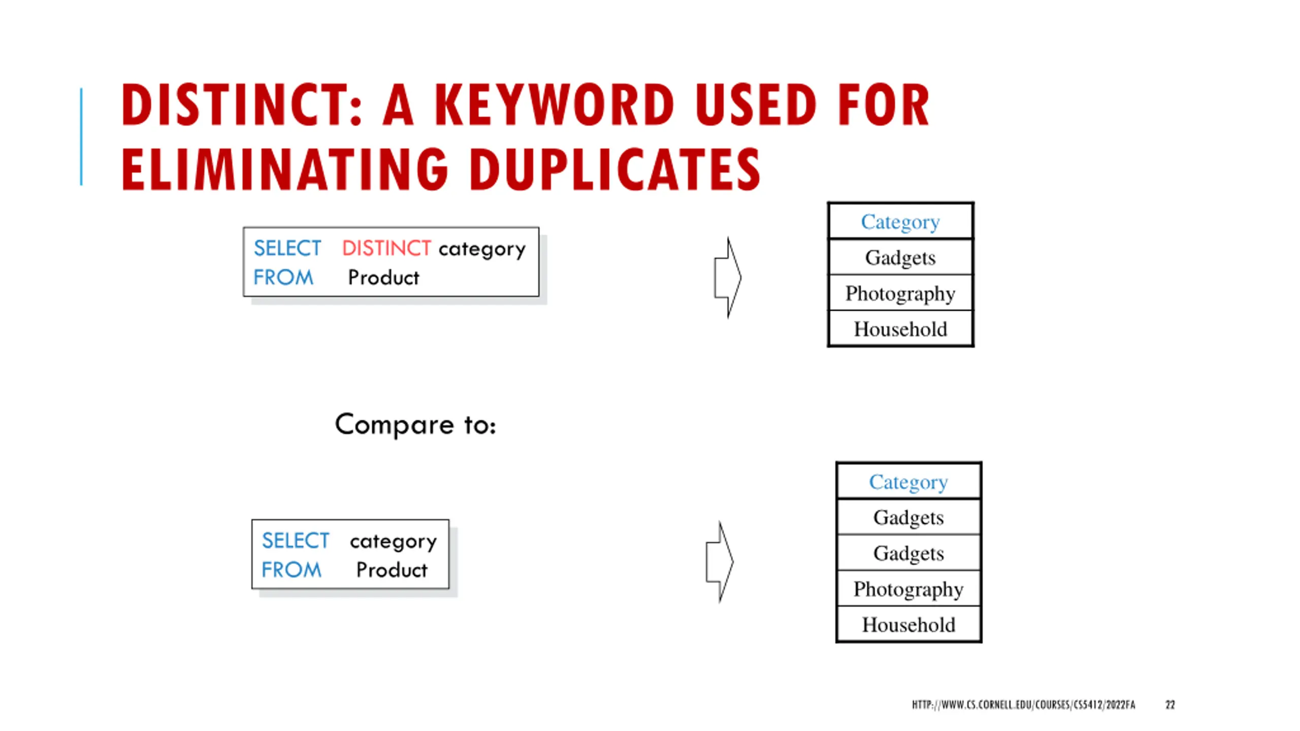 DISTINCT: A KEYWORD USED FOR ELIMINATING DUPLICATES Category SELECT DISTINCT category FROM Product Gadgets Photography Household Compare to: Category Gadgets SELECT category FROM Product Gadgets Photography Household HTTP://WWW.CS.CORNELL.EDU/COURSES/CS5412/2022FA 22