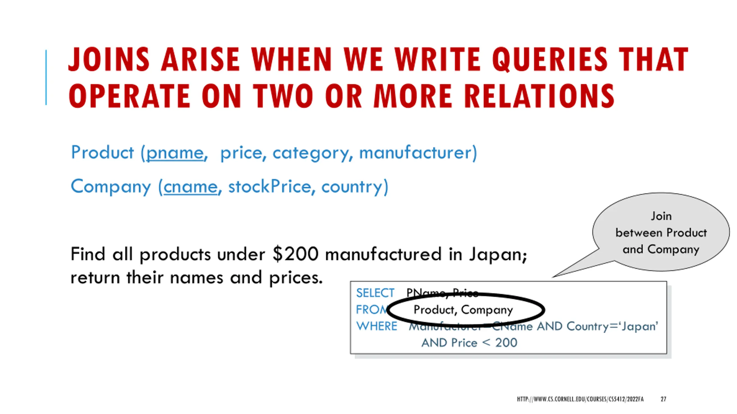 JOINS ARISE WHEN WE WRITE QUERIES THAT OPERATE ON TWO OR MORE RELATIONS Product (pname, price, category, manufacturer) Company (cname, stockPrice, country) Join between Product and Company Find all products under $200 manufactured in Japan; return their names and prices. SELECT PName, Price FROM Product, Company WHERE Manufacturer=CName AND Country= Japan AND Price < 200 HTTP://WWW.CS.CORNELL.EDU/COURSES/CS5412/2022FA 27