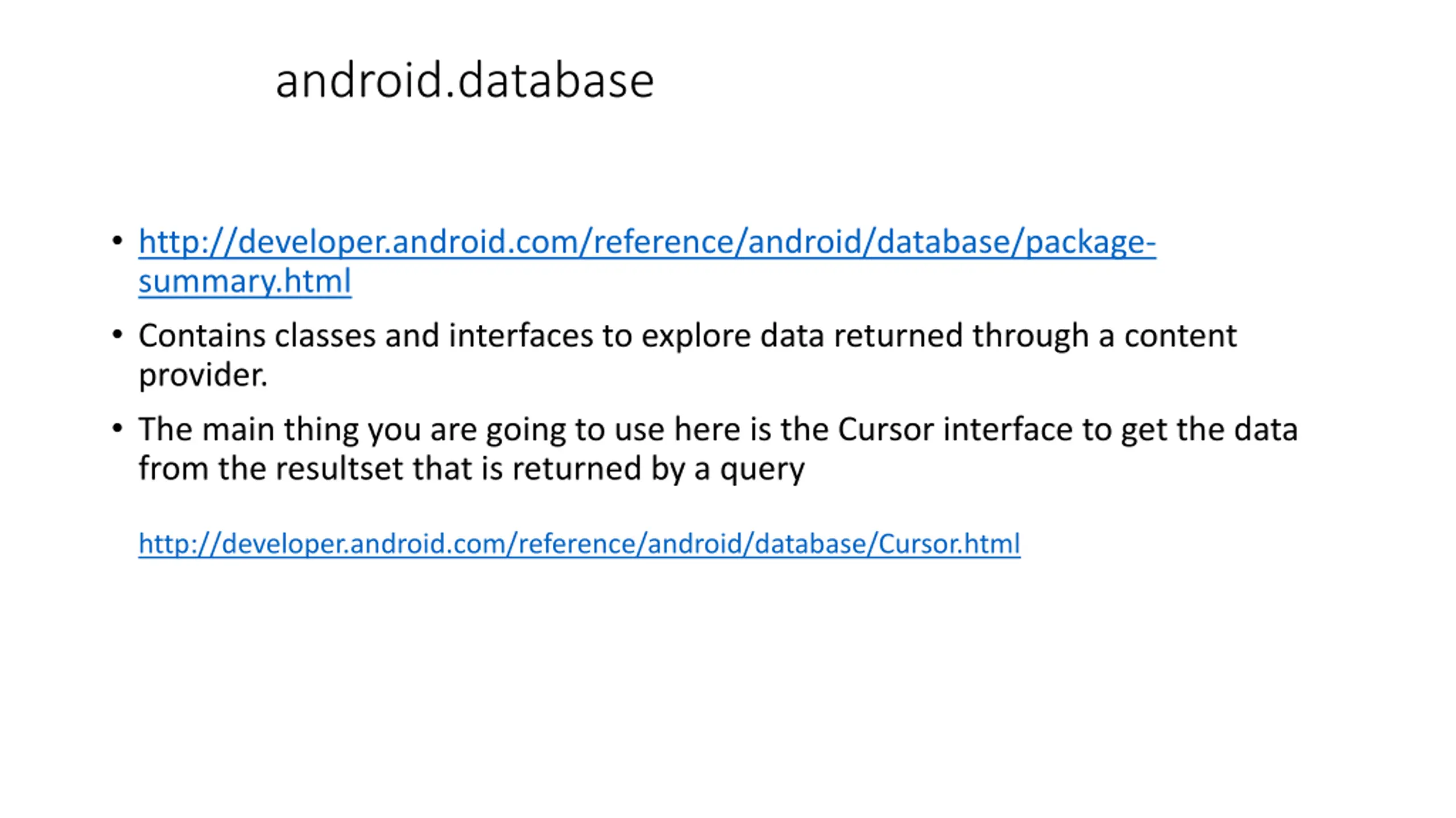 android.database http://developer.android.com/reference/android/database/package- summary.html Contains classes and interfaces to explore data returned through a content provider. The main thing you are going to use here is the Cursor interface to get the data from the resultset that is returned by a query http://developer.android.com/reference/android/database/Cursor.html