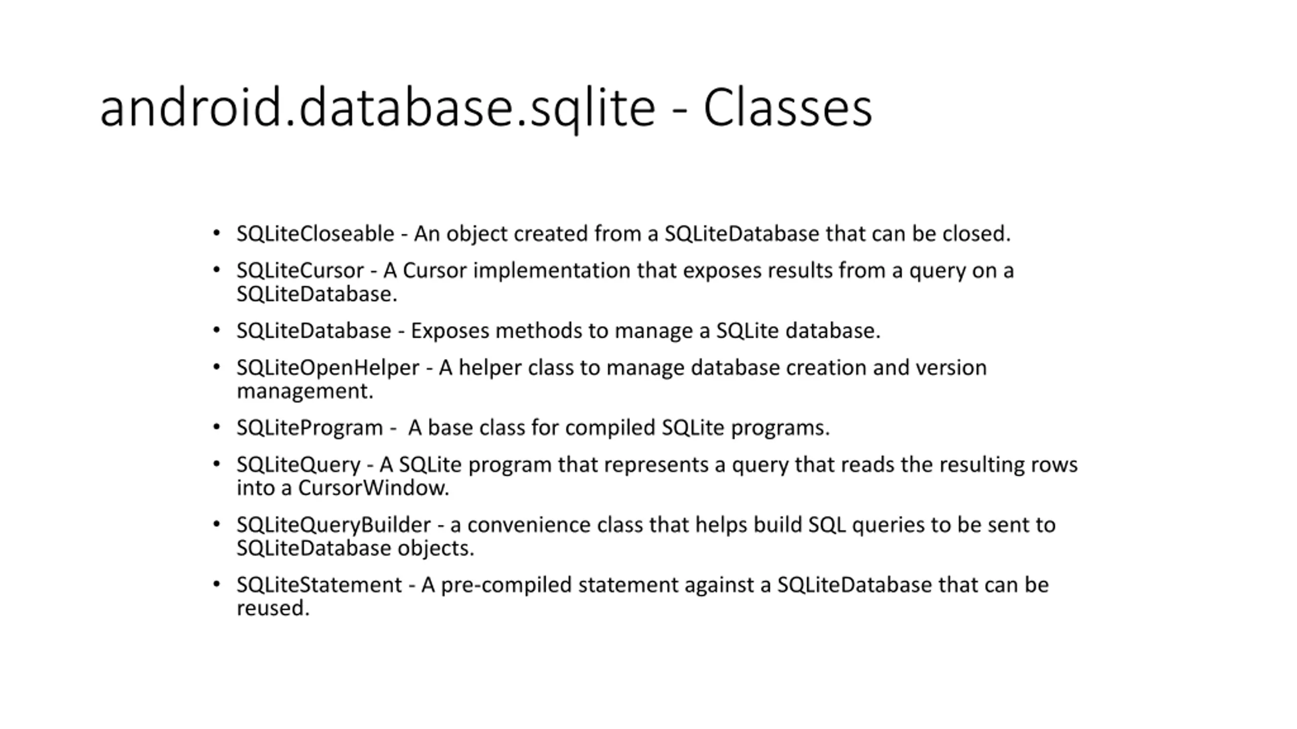 android.database.sqlite - Classes SQLiteCloseable - An object created from a SQLiteDatabase that can be closed. SQLiteCursor - A Cursor implementation that exposes results from a query on a SQLiteDatabase. SQLiteDatabase - Exposes methods to manage a SQLite database. SQLiteOpenHelper - A helper class to manage database creation and version management. SQLiteProgram - A base class for compiled SQLite programs. SQLiteQuery - A SQLite program that represents a query that reads the resulting rows into a CursorWindow. SQLiteQueryBuilder - a convenience class that helps build SQL queries to be sent to SQLiteDatabase objects. SQLiteStatement - A pre-compiled statement against a SQLiteDatabase that can be reused.