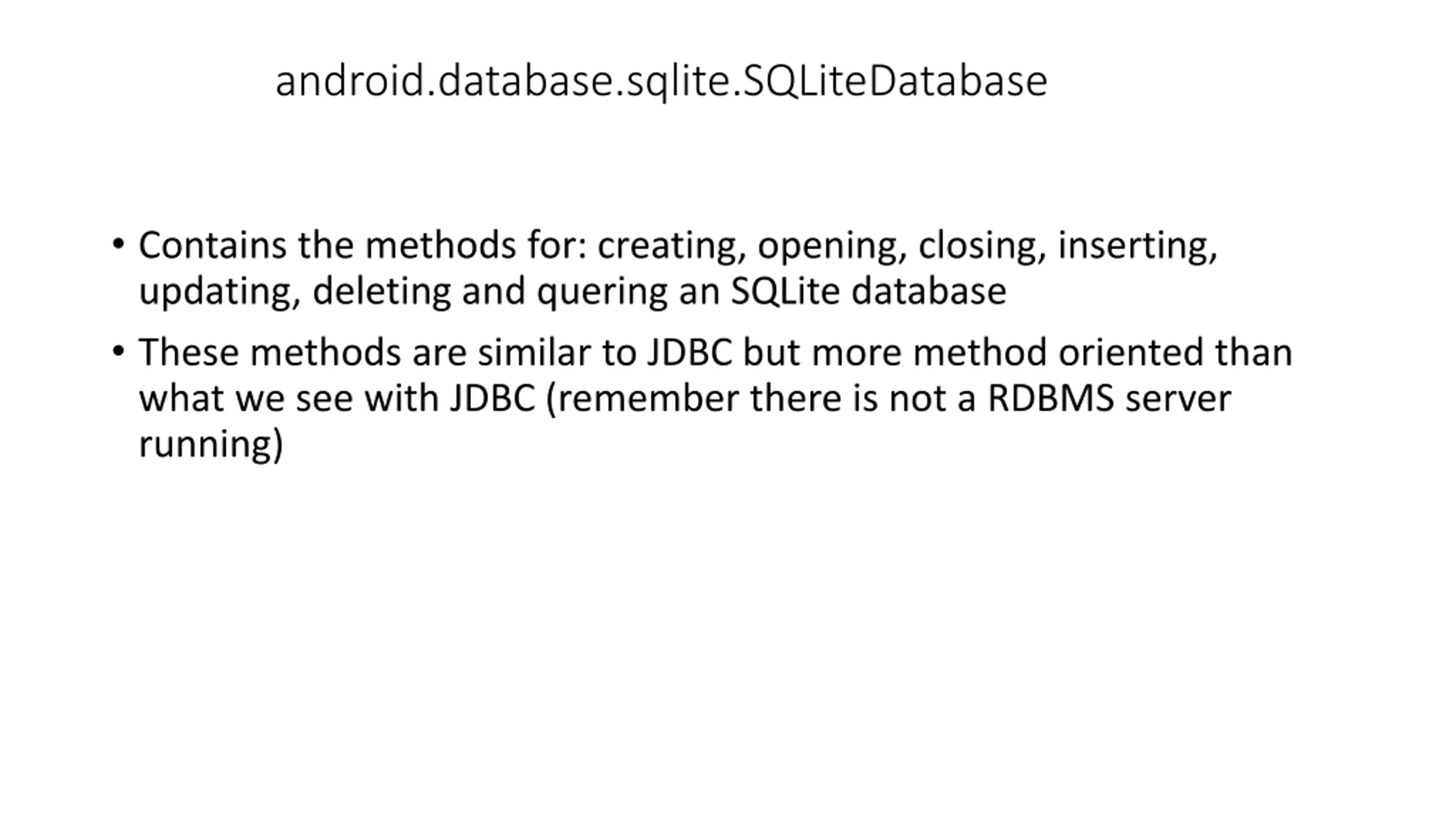 android.database.sqlite.SQLiteDatabase Contains the methods for: creating, opening, closing, inserting, updating, deleting and quering an SQLite database These methods are similar to JDBC but more method oriented than what we see with JDBC (remember there is not a RDBMS server running)