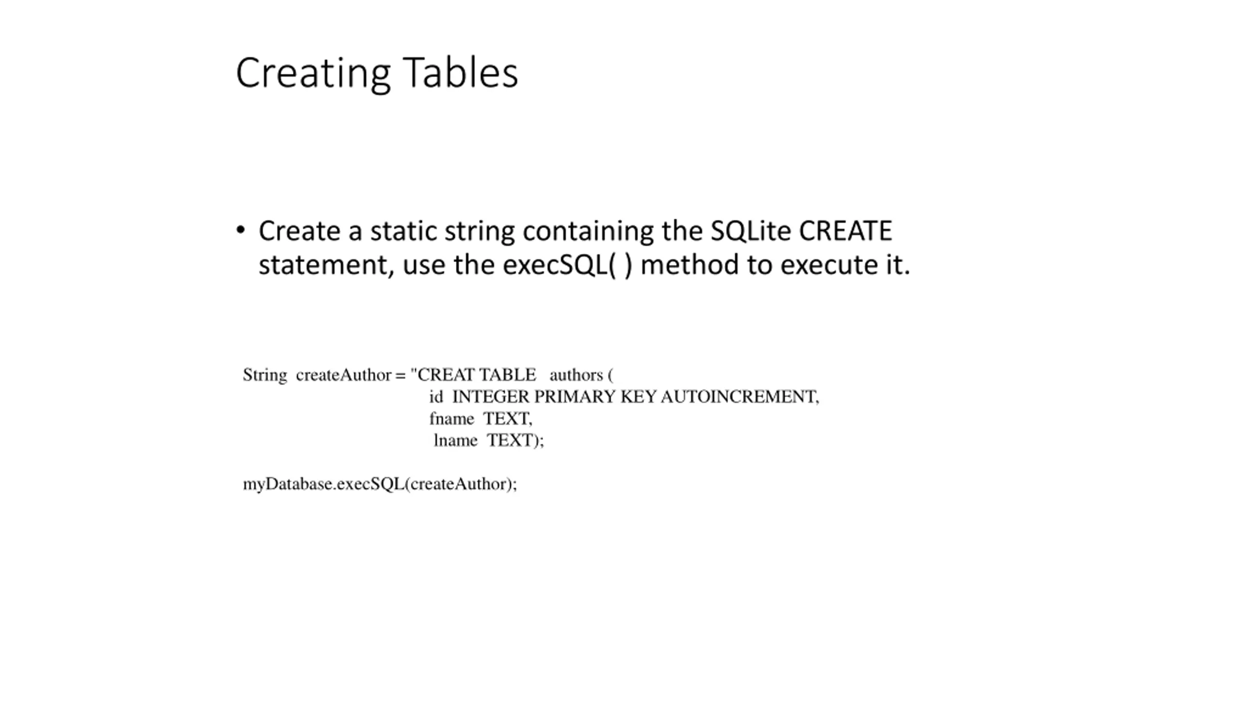 Creating Tables Create a static string containing the SQLite CREATE statement, use the execSQL( ) method to execute it. String createAuthor = "CREAT TABLE authors ( id INTEGER PRIMARY KEY AUTOINCREMENT, fname TEXT, lname TEXT); myDatabase.execSQL(createAuthor);