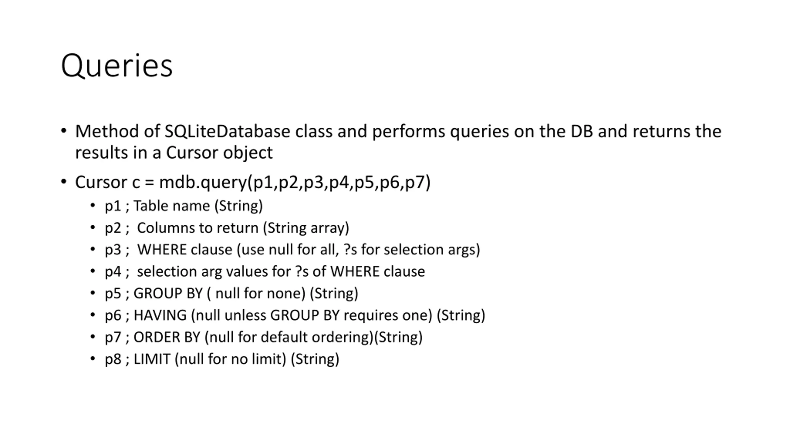 Queries Method of SQLiteDatabase class and performs queries on the DB and returns the results in a Cursor object Cursor c = mdb.query(p1,p2,p3,p4,p5,p6,p7) p1 ; Table name (String) p2 ; Columns to return (String array) p3 ; WHERE clause (use null for all, ?s for selection args) p4 ; selection arg values for ?s of WHERE clause p5 ; GROUP BY ( null for none) (String) p6 ; HAVING (null unless GROUP BY requires one) (String) p7 ; ORDER BY (null for default ordering)(String) p8 ; LIMIT (null for no limit) (String)