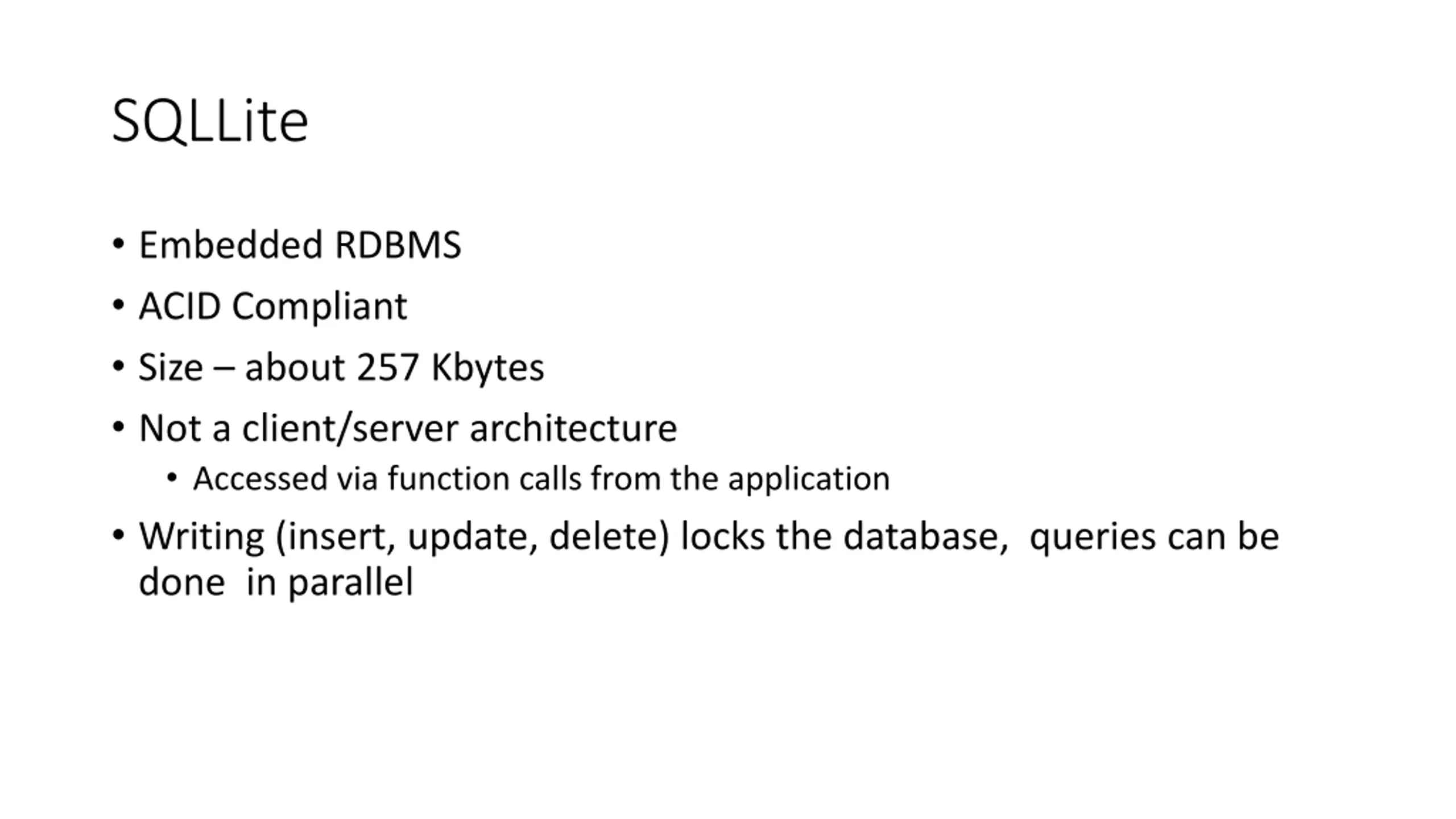 SQLLite Embedded RDBMS ACID Compliant Size about 257 Kbytes Not a client/server architecture Accessed via function calls from the application Writing (insert, update, delete) locks the database, queries can be done in parallel