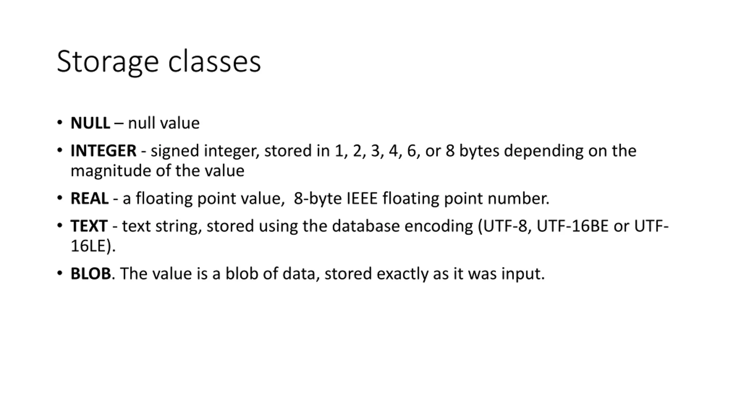 Storage classes NULL null value INTEGER - signed integer, stored in 1, 2, 3, 4, 6, or 8 bytes depending on the magnitude of the value REAL - a floating point value, 8-byte IEEE floating point number. TEXT - text string, stored using the database encoding (UTF-8, UTF-16BE or UTF- 16LE). BLOB. The value is a blob of data, stored exactly as it was input.