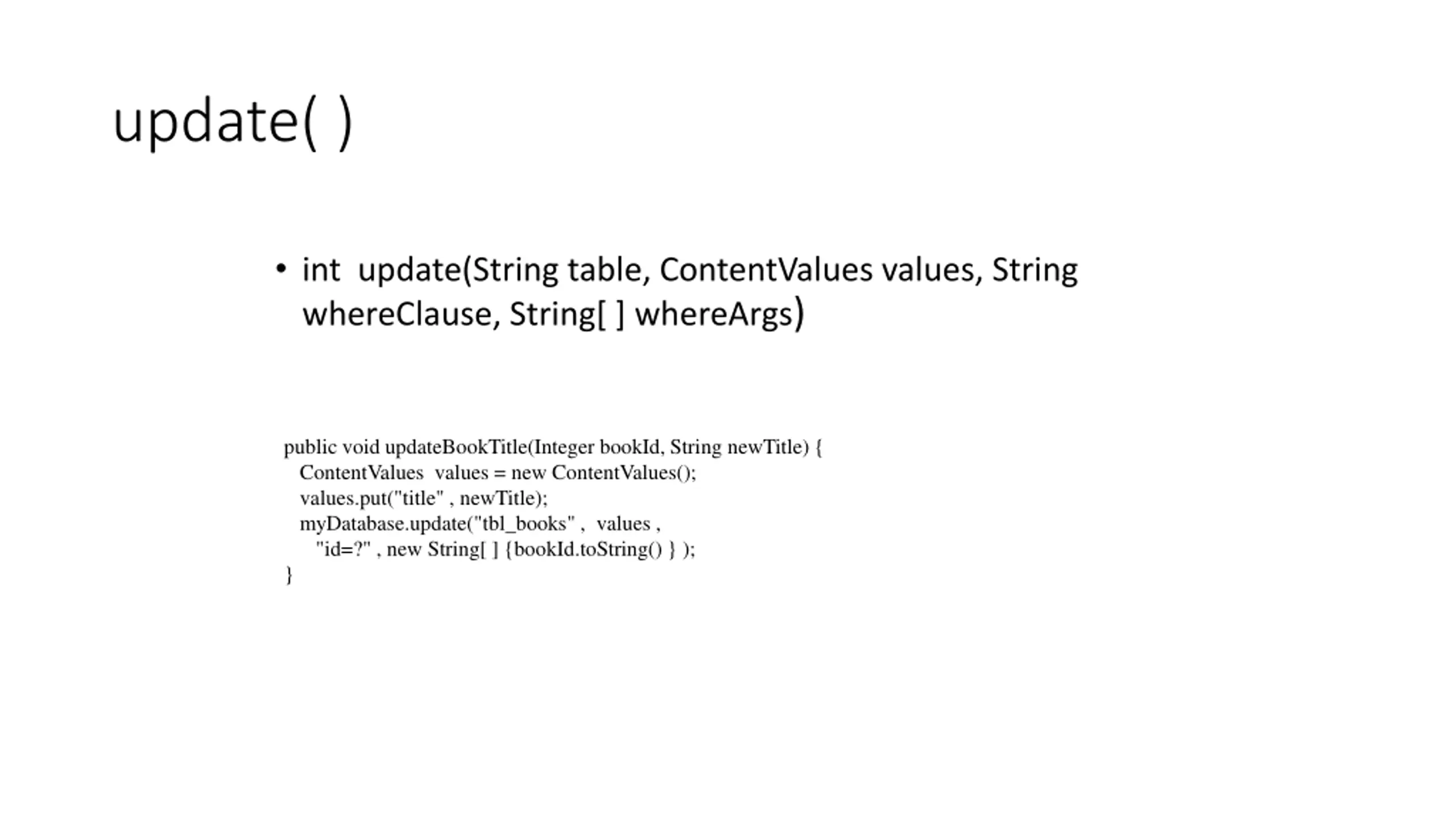 update( ) int update(String table, ContentValues values, String whereClause, String[ ] whereArgs) public void updateBookTitle(Integer bookId, String newTitle) { ContentValues values = new ContentValues(); values.put("title" , newTitle); myDatabase.update("tbl_books" , values , "id=?" , new String[ ] {bookId.toString() } ); }