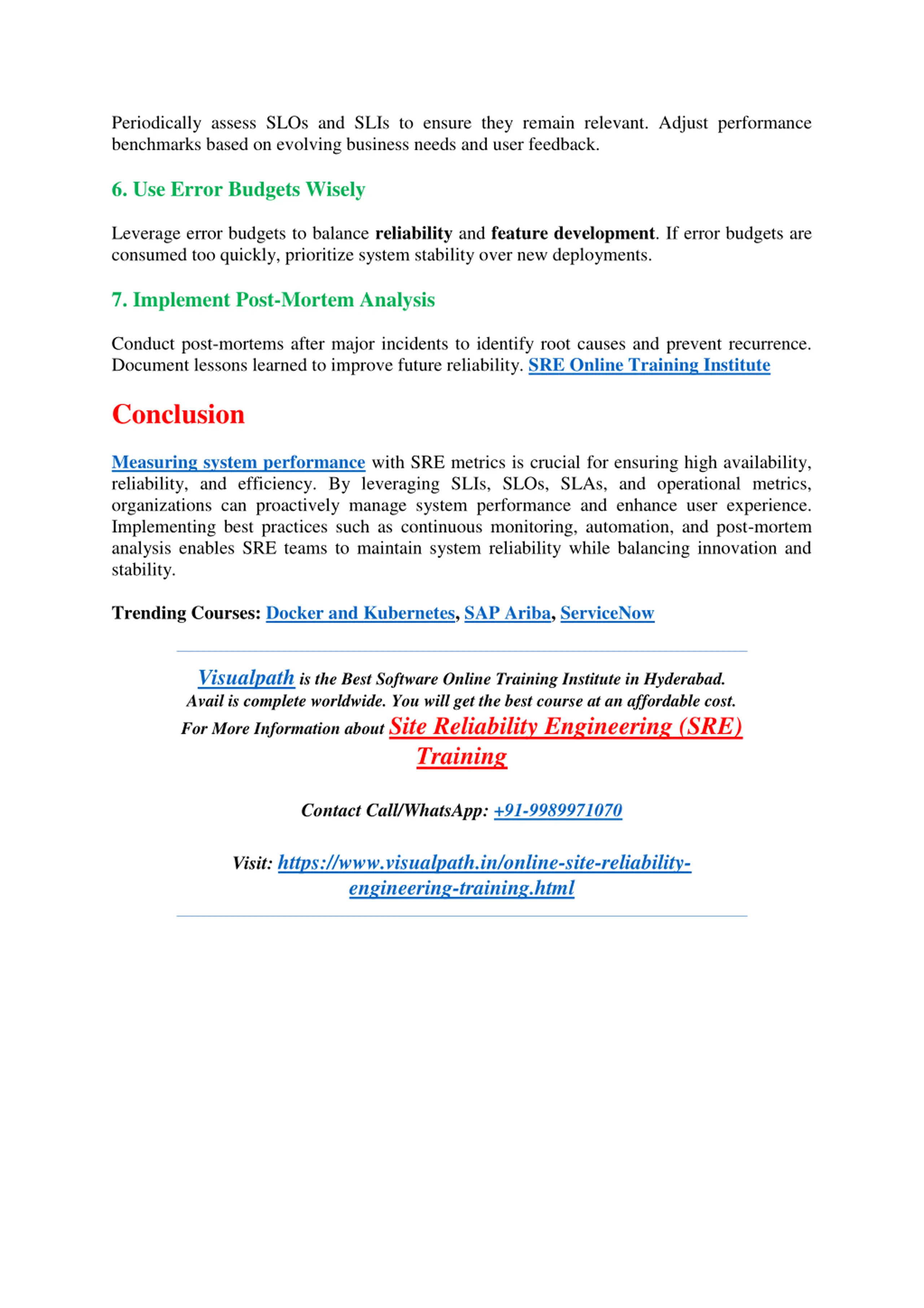 Periodically assess SLOs and SLIs to ensure they remain relevant. Adjust performance benchmarks based on evolving business needs and user feedback. 6. Use Error Budgets Wisely Leverage error budgets to balance reliability and feature development. If error budgets are consumed too quickly, prioritize system stability over new deployments. 7. Implement Post-Mortem Analysis Conduct post-mortems after major incidents to identify root causes and prevent recurrence. Document lessons learned to improve future reliability. SRE Online Training Institute Conclusion Measuring system performance with SRE metrics is crucial for ensuring high availability, reliability, and efficiency. By leveraging SLIs, SLOs, SLAs, and operational metrics, organizations can proactively manage system performance and enhance user experience. Implementing best practices such as continuous monitoring, automation, and post-mortem analysis enables SRE teams to maintain system reliability while balancing innovation and stability. Trending Courses:Docker and Kubernetes, SAP Ariba, ServiceNow Visualpath is the Best Software Online Training Institute in Hyderabad. Avail is complete worldwide. You will get the best course at an affordable cost. For More Information about Site Reliability Engineering (SRE) Training Contact Call/WhatsApp: +91-9989971070 Visit: https://www.visualpath.in/online-site-reliability- engineering-training.html