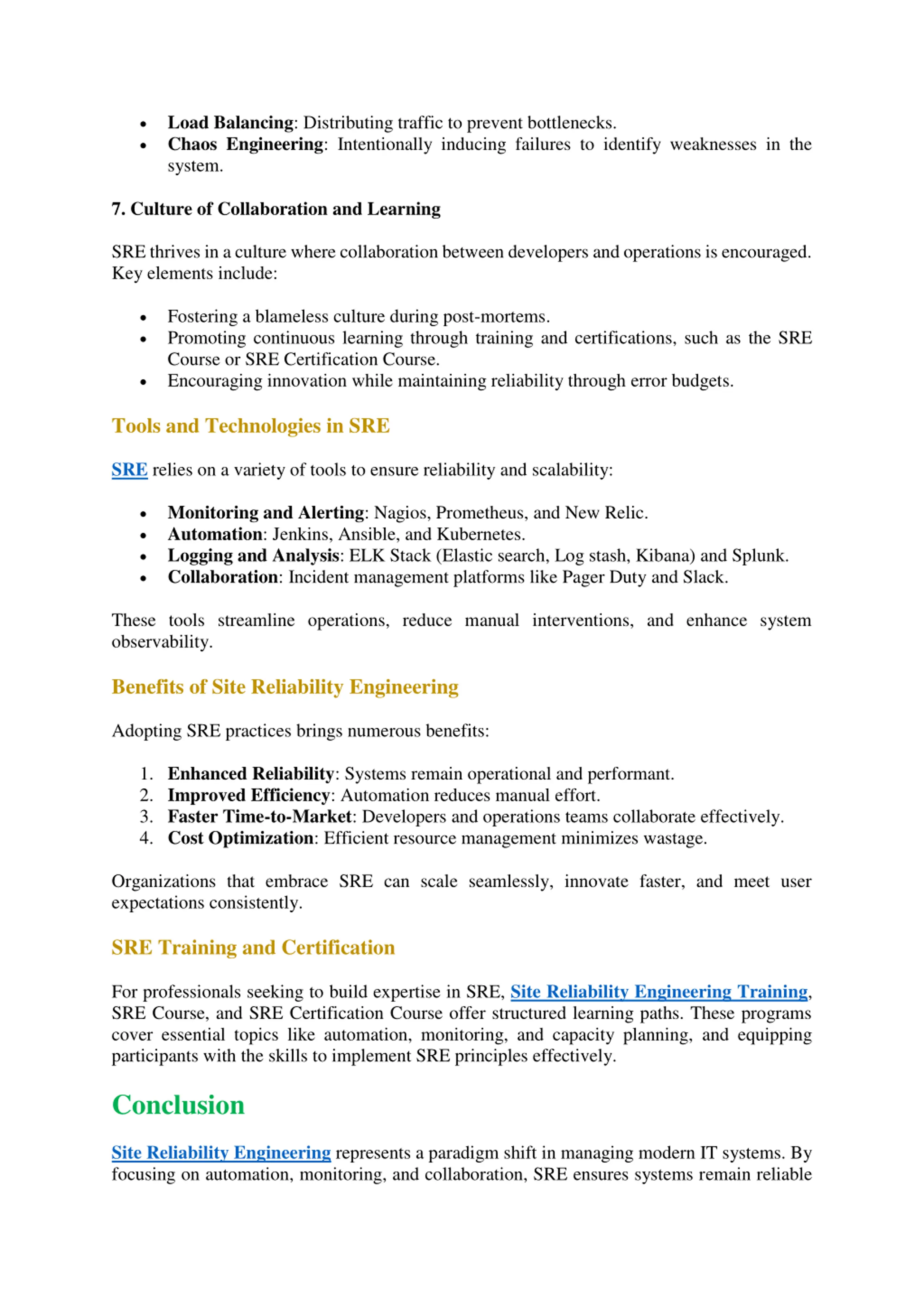 Load Balancing: Distributing traffic to prevent bottlenecks. Chaos Engineering: Intentionally inducing failures to identify weaknesses in the system. 7. Culture of Collaboration and Learning SRE thrives in a culture where collaboration between developers and operations is encouraged. Key elements include: Fostering a blameless culture during post-mortems. Promoting continuous learning through training and certifications, such as the SRE Course or SRE Certification Course. Encouraging innovation while maintaining reliability through error budgets. Tools and Technologies in SRE SRE relies on a variety of tools to ensure reliability and scalability: Monitoring and Alerting: Nagios, Prometheus, and New Relic. Automation: Jenkins, Ansible, and Kubernetes. Logging and Analysis: ELK Stack (Elastic search, Log stash, Kibana) and Splunk. Collaboration: Incident management platforms like Pager Duty and Slack. These tools streamline operations, reduce manual interventions, and enhance system observability. Benefits of Site Reliability Engineering Adopting SRE practices brings numerous benefits: 1.Enhanced Reliability: Systems remain operational and performant. 2.Improved Efficiency: Automation reduces manual effort. 3.Faster Time-to-Market: Developers and operations teams collaborate effectively. 4.Cost Optimization: Efficient resource management minimizes wastage. Organizations that embrace SRE can scale seamlessly, innovate faster, and meet user expectations consistently. SRE Training and Certification For professionals seeking to build expertise in SRE, Site Reliability Engineering Training, SRE Course, and SRE Certification Course offer structured learning paths. These programs cover essential topics like automation, monitoring, and capacity planning, and equipping participants with the skills to implement SRE principles effectively. Conclusion Site Reliability Engineering represents a paradigm shift in managing modern IT systems. By focusing on automation, monitoring, and collaboration, SRE ensures systems remain reliable