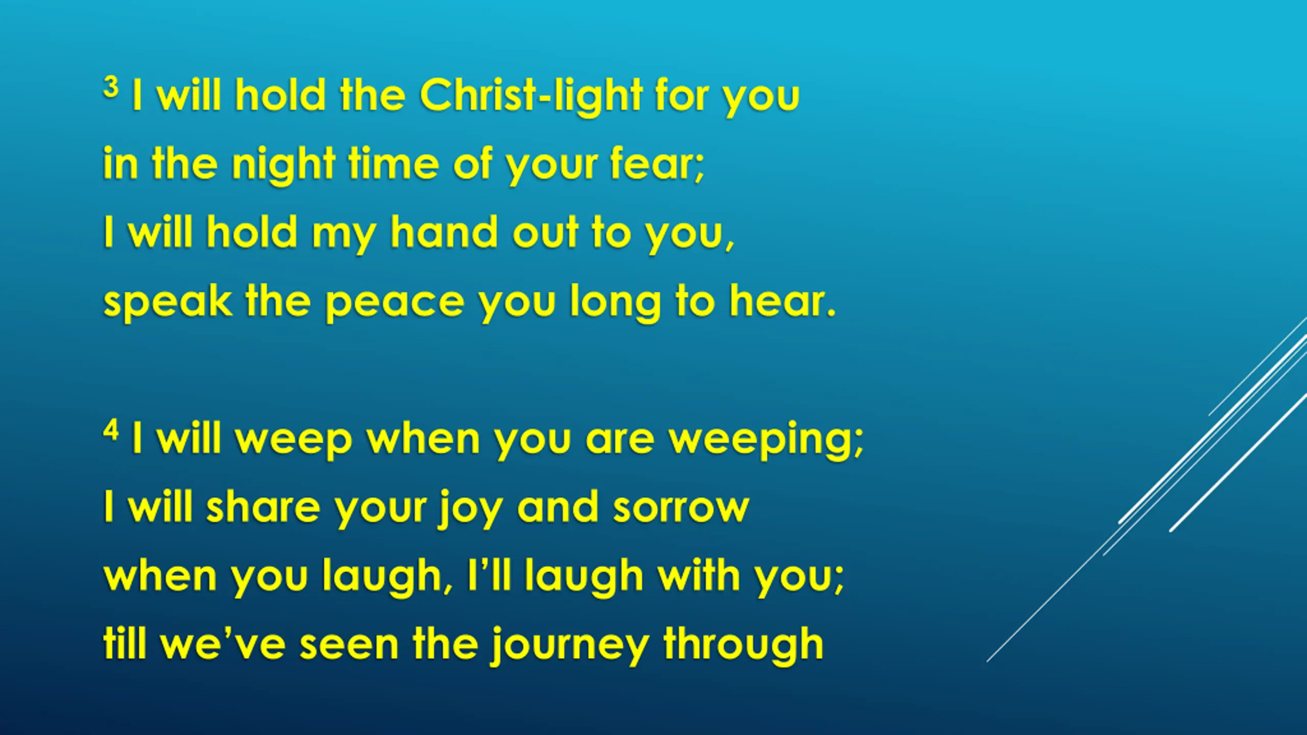 3 I will hold the Christ-light for you in the night time of your fear; I will hold my hand out to you, speak the peace you long to hear. 4 I will weep when you are weeping; I will share your joy and sorrow when you laugh, I ll laugh with you; till we ve seen the journey through