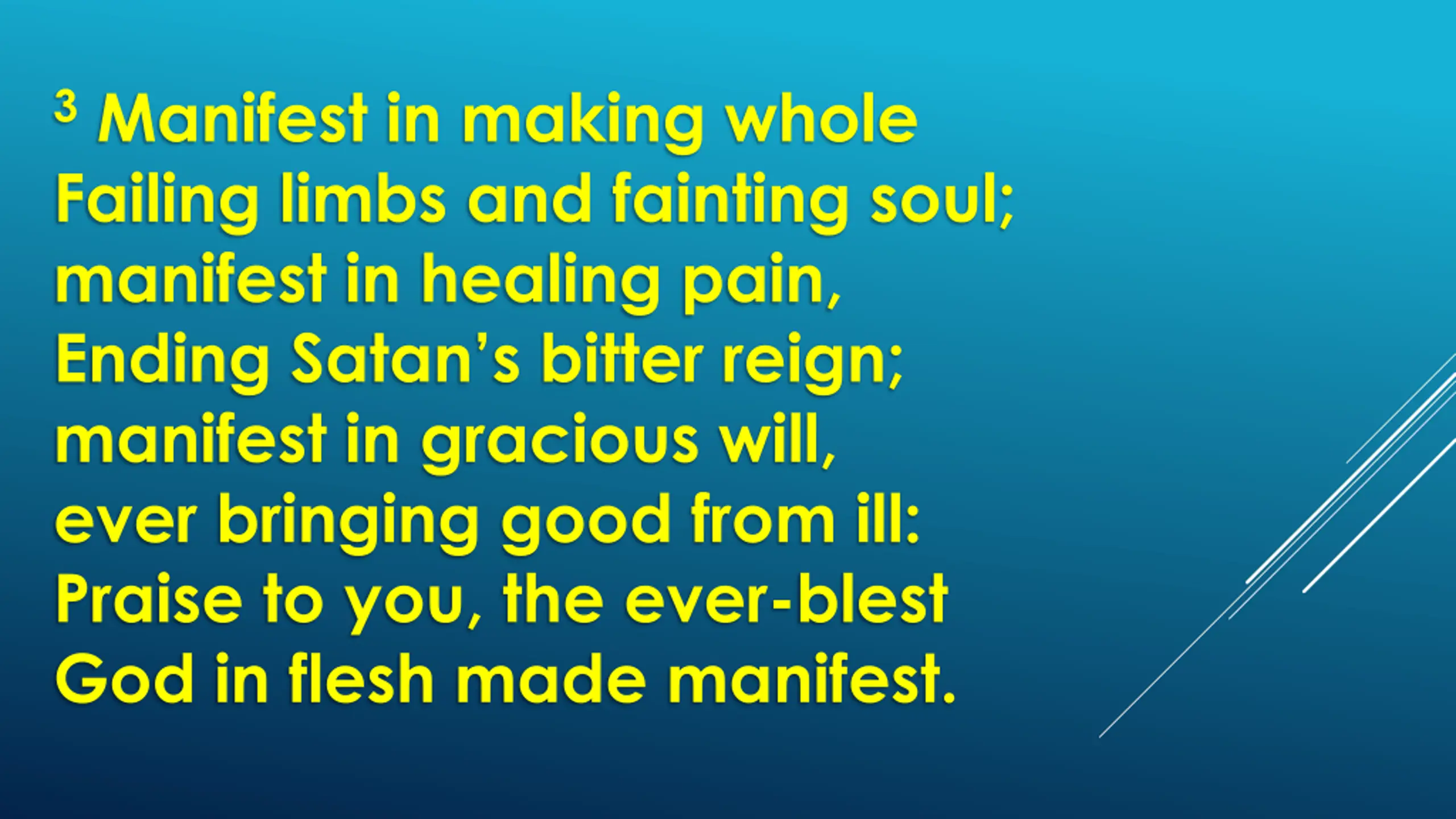 3 Manifest in making whole Failing limbs and fainting soul; manifest in healing pain, Ending Satan s bitter reign; manifest in gracious will, ever bringing good from ill: Praise to you, the ever-blest God in flesh made manifest.