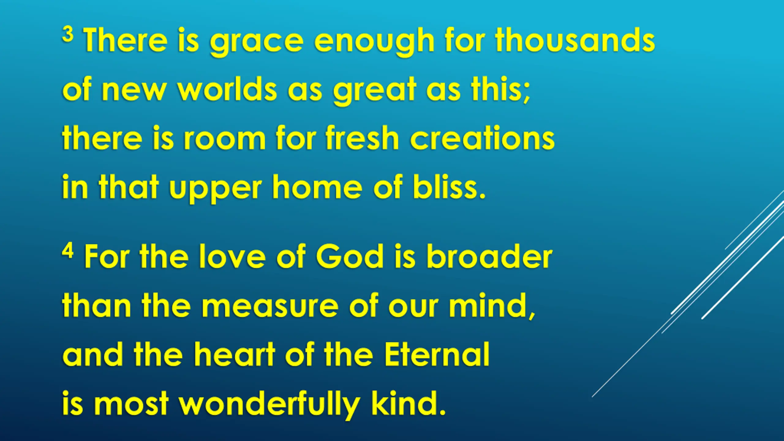 3 There is grace enough for thousands of new worlds as great as this; there is room for fresh creations in that upper home of bliss. 4 For the love of God is broader than the measure of our mind, and the heart of the Eternal is most wonderfully kind.