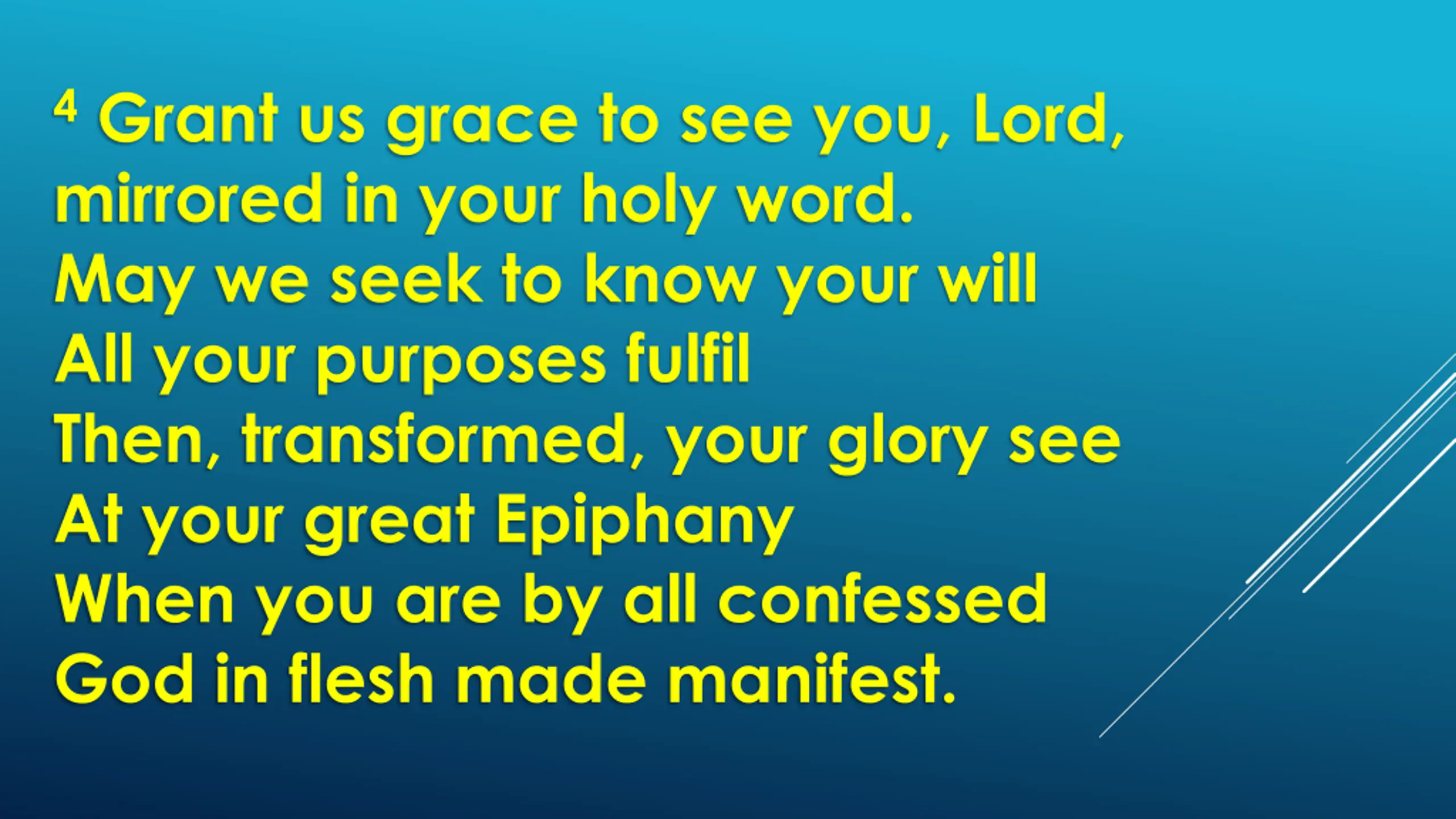 4 Grant us grace to see you, Lord, mirrored in your holy word. May we seek to know your will All your purposes fulfil Then, transformed, your glory see At your great Epiphany When you are by all confessed God in flesh made manifest.