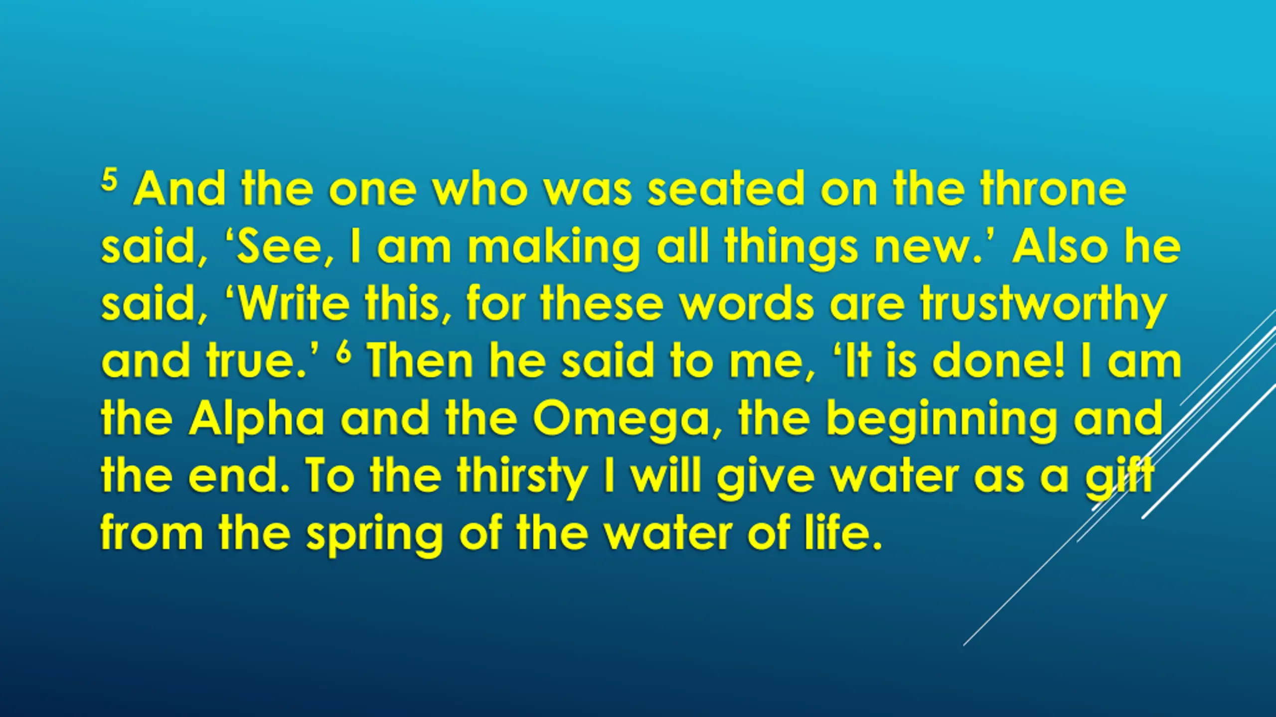 5 And the one who was seated on the throne said, See, I am making all things new. Also he said, Write this, for these words are trustworthy and true. 6Then he said to me, It is done! I am the Alpha and the Omega, the beginning and the end. To the thirsty I will give water as a gift from the spring of the water of life.