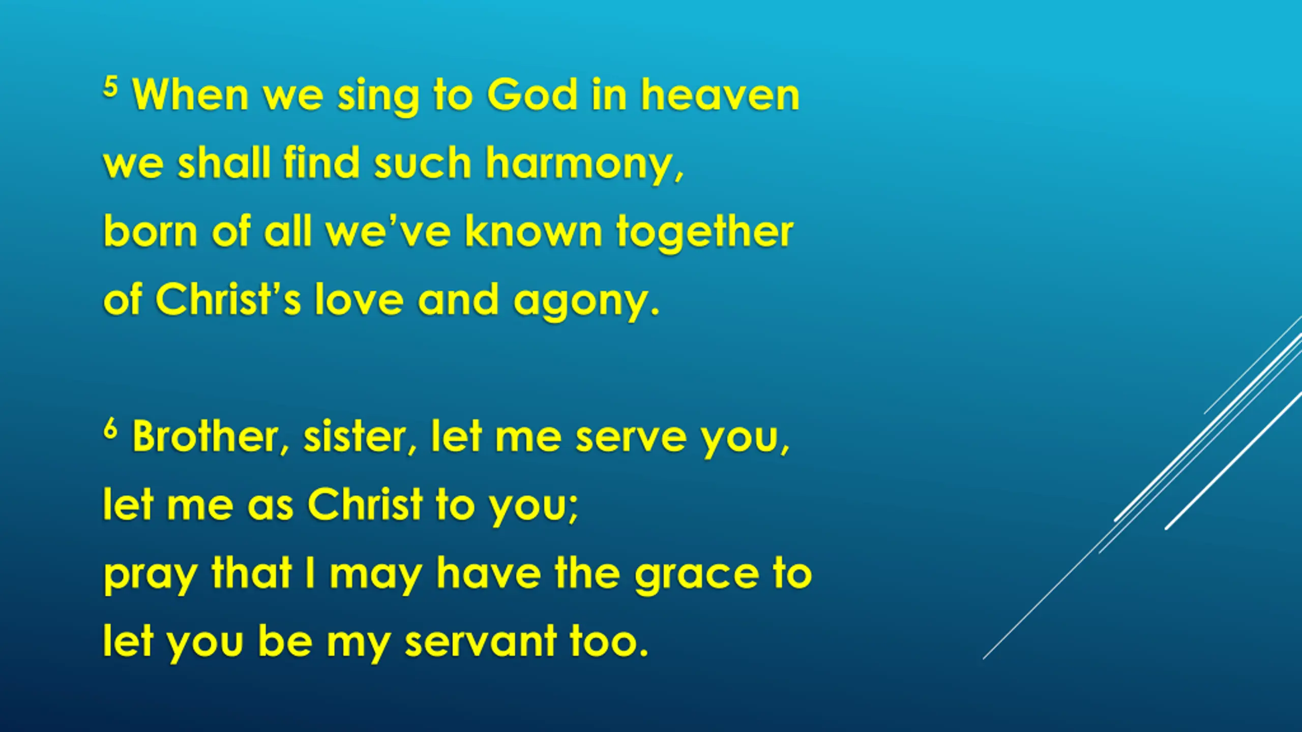 5 When we sing to God in heaven we shall find such harmony, born of all we ve known together of Christ s love and agony. 6 Brother, sister, let me serve you, let me as Christ to you; pray that I may have the grace to let you be my servant too.