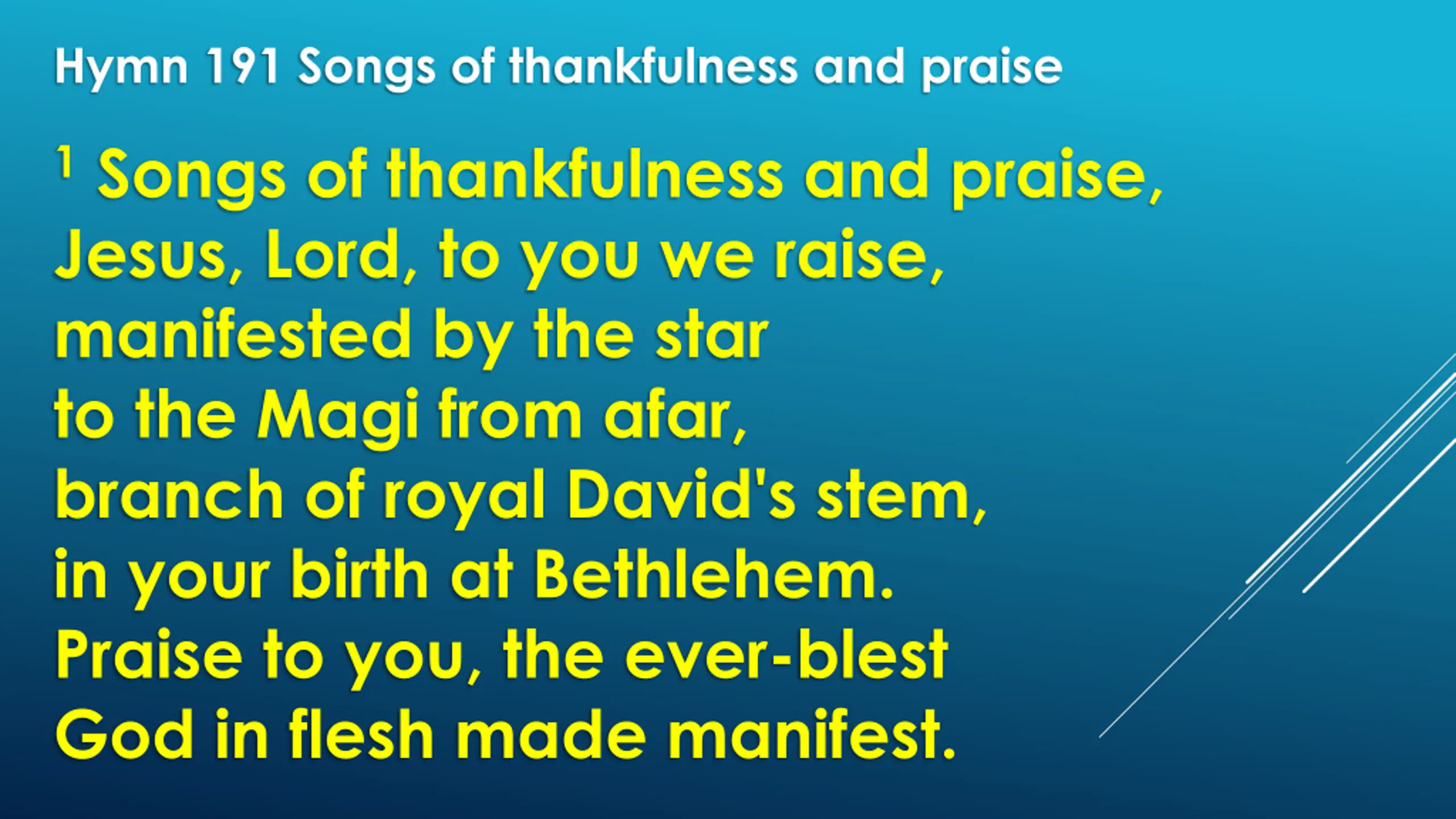 Hymn 191 Songs of thankfulness and praise 1 Songs of thankfulness and praise, Jesus, Lord, to you we raise, manifested by the star to the Magi from afar, branch of royal David's stem, in your birth at Bethlehem. Praise to you, the ever-blest God in flesh made manifest.