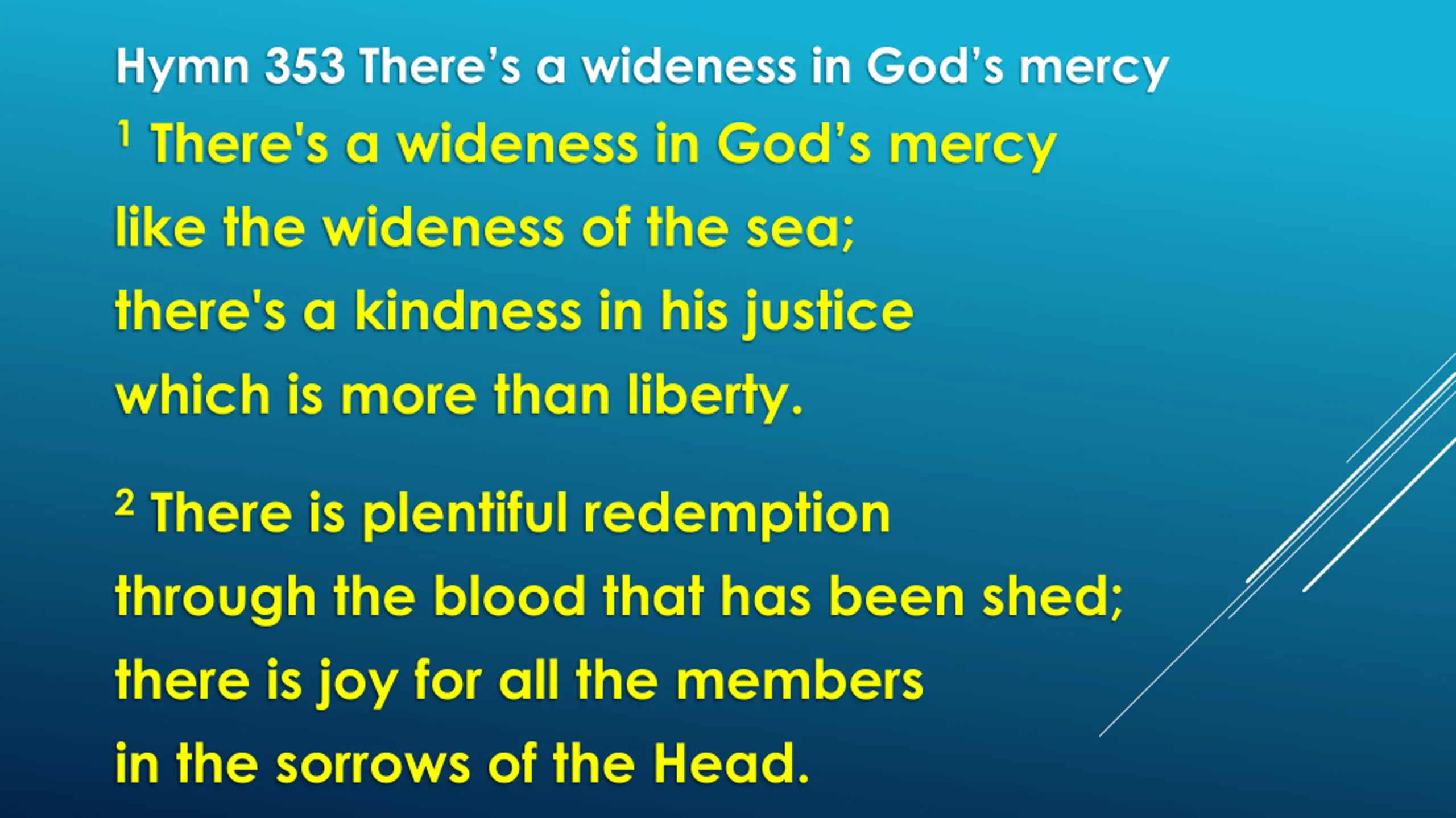 Hymn 353 Theres a wideness in Gods mercy 1There's a wideness in God s mercy like the wideness of the sea; there's a kindness in his justice which is more than liberty. 2 There is plentiful redemption through the blood that has been shed; there is joy for all the members in the sorrows of the Head.