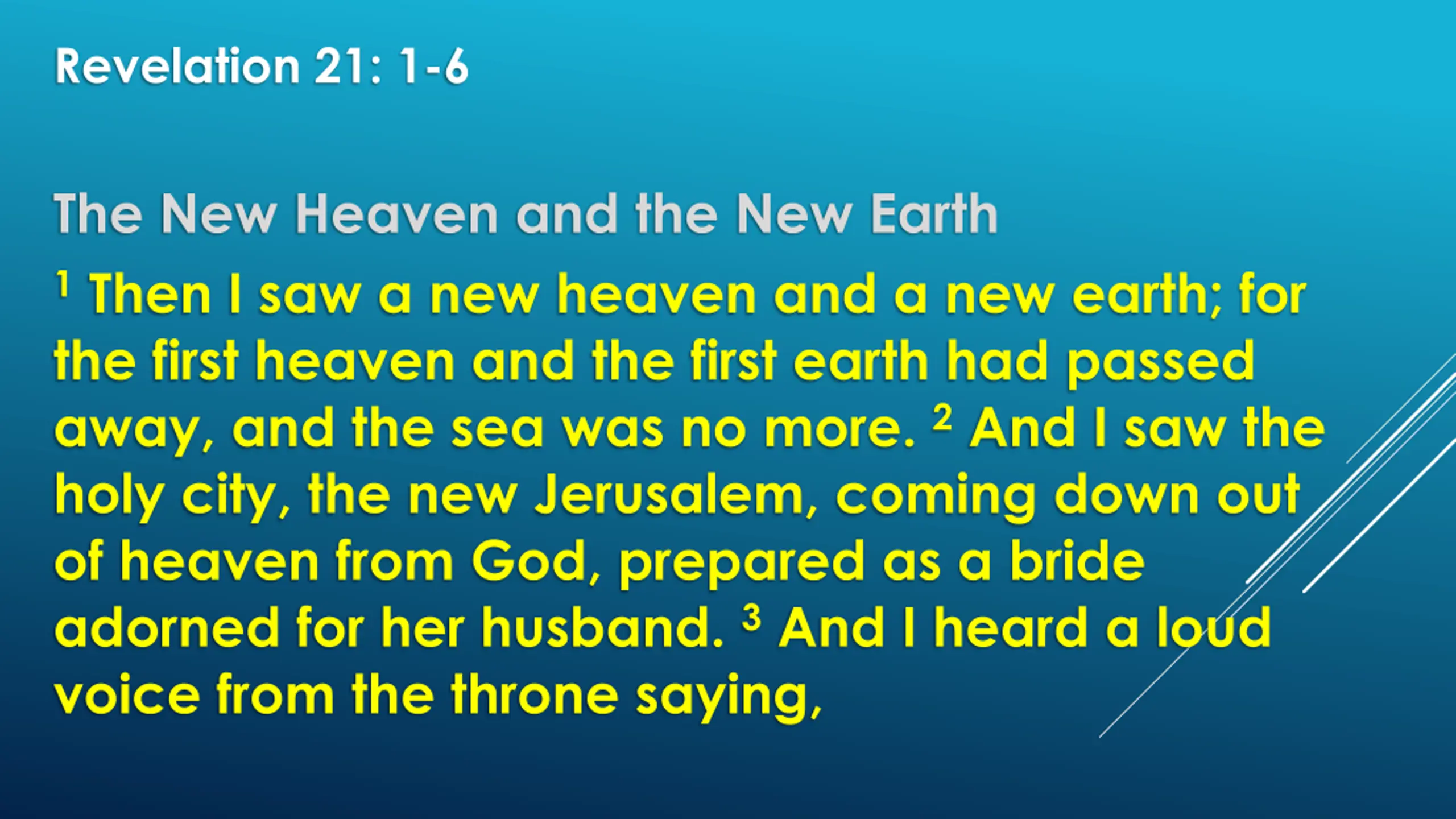 Revelation 21: 1-6 The New Heaven and the New Earth 1 Then I saw a new heaven and a new earth; for the first heaven and the first earth had passed away, and the sea was no more. 2 And I saw the holy city, the new Jerusalem, coming down out of heaven from God, prepared as a bride adorned for her husband. 3 And I heard a loud voice from the throne saying,