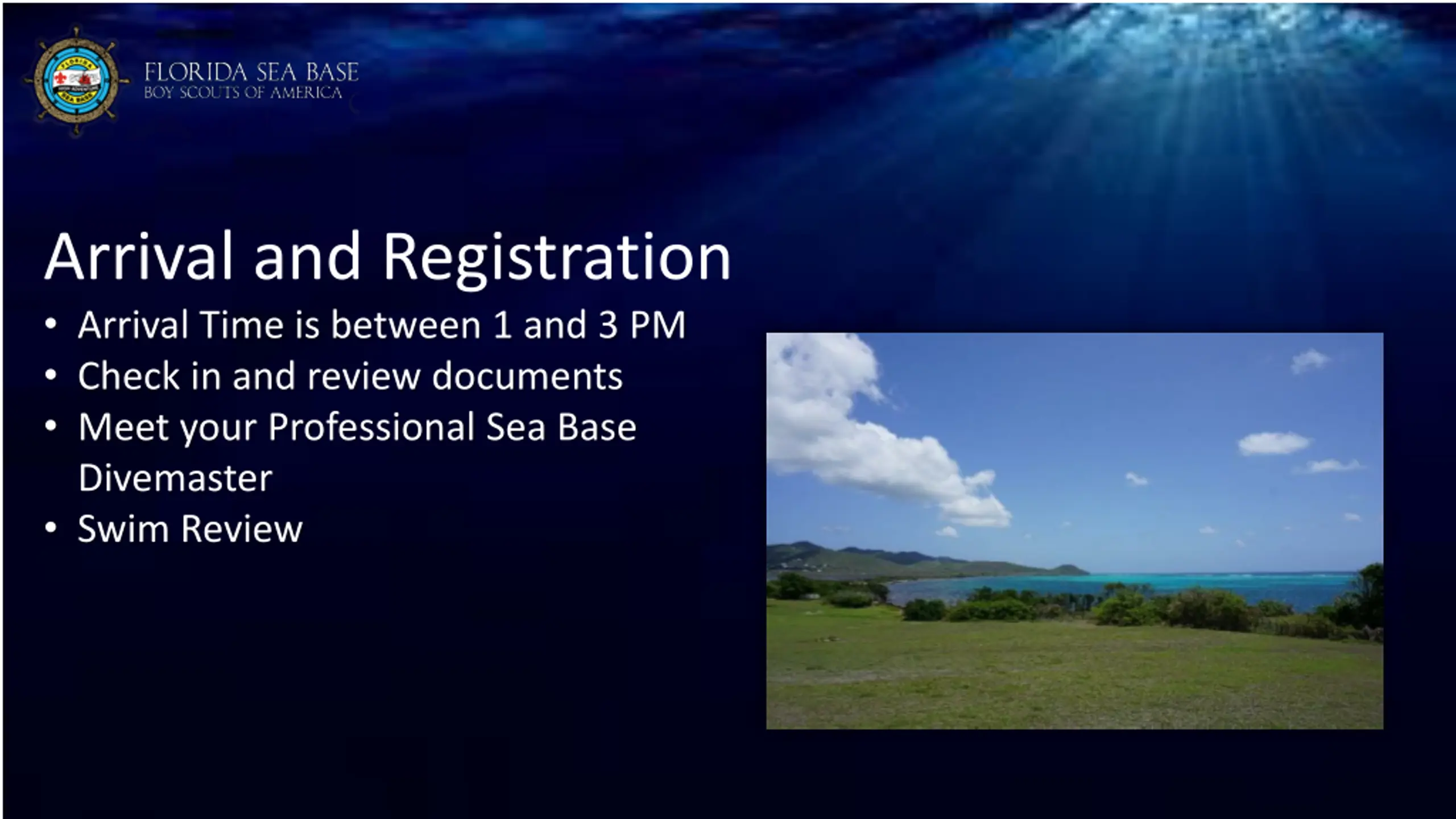 Arrival and Registration Arrival Time is between 1 and 3 PM Check in and review documents Meet your Professional Sea Base Divemaster Swim Review