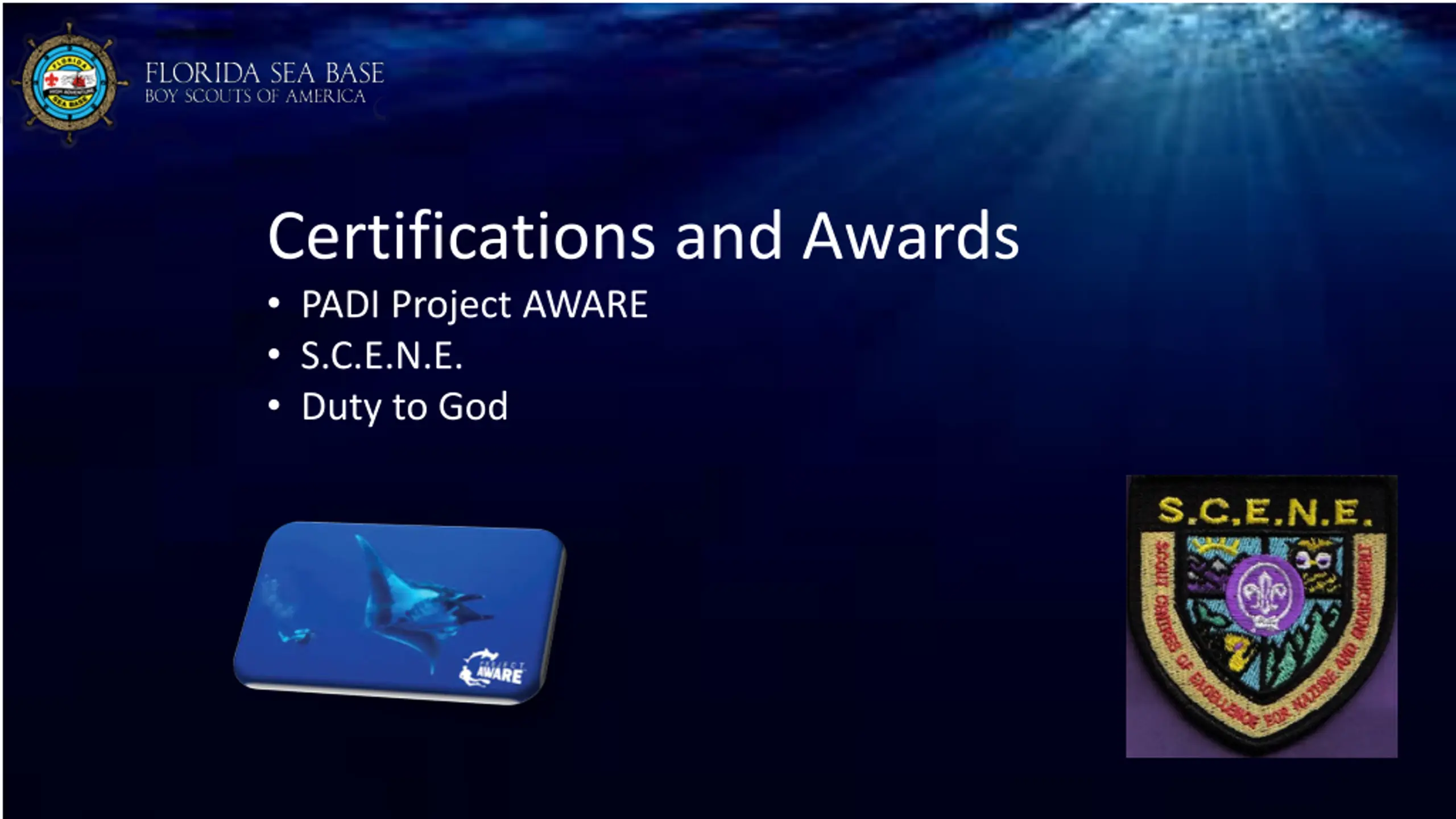 Certifications and Awards PADI Project AWARE S.C.E.N.E. Duty to God