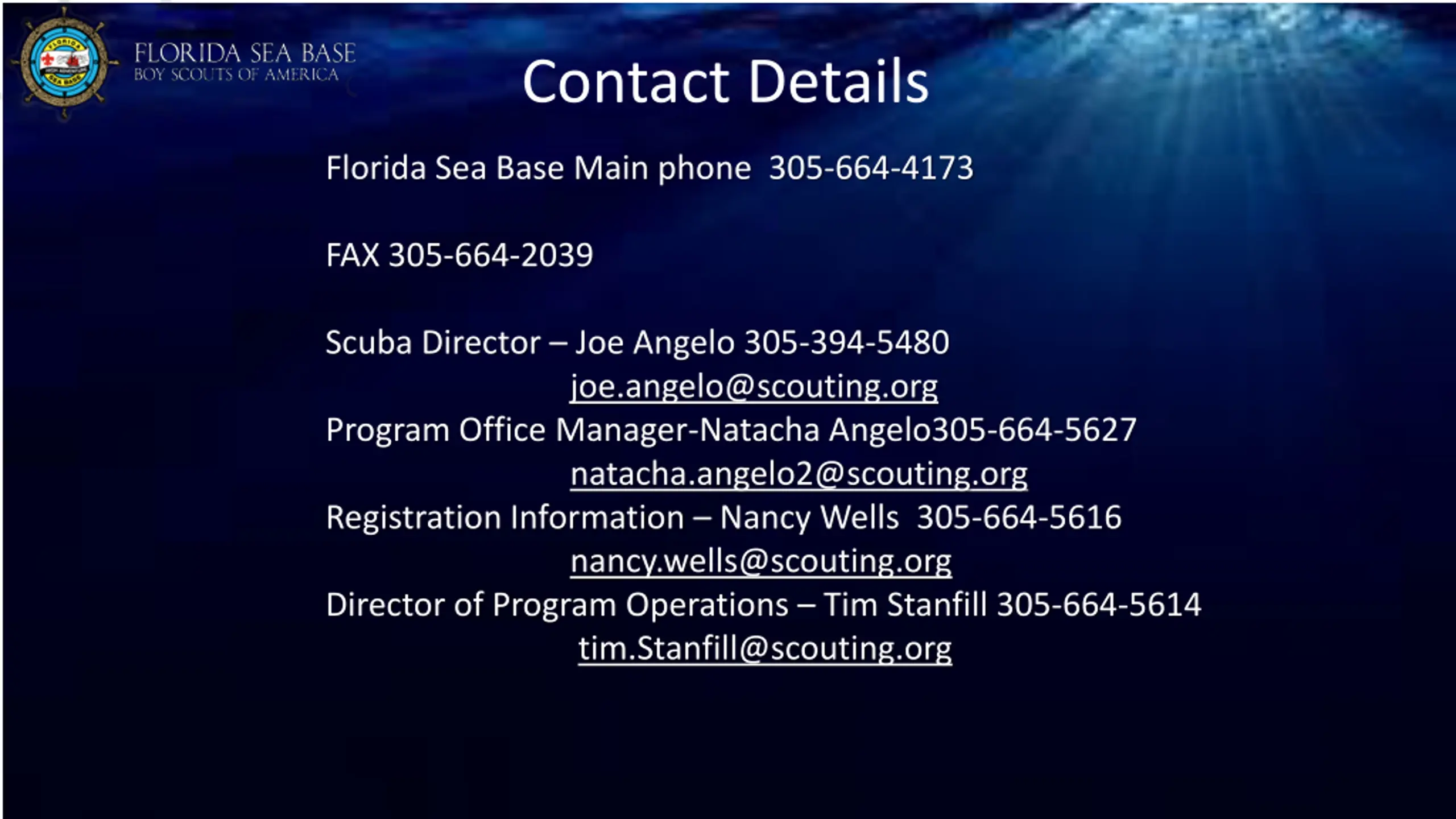 Contact Details Florida Sea Base Main phone 305-664-4173 FAX 305-664-2039 Scuba Director Joe Angelo 305-394-5480 joe.angelo@scouting.org Program Office Manager-Natacha Angelo305-664-5627 natacha.angelo2@scouting.org Registration Information Nancy Wells 305-664-5616 nancy.wells@scouting.org Director of Program Operations Tim Stanfill 305-664-5614 tim.Stanfill@scouting.org