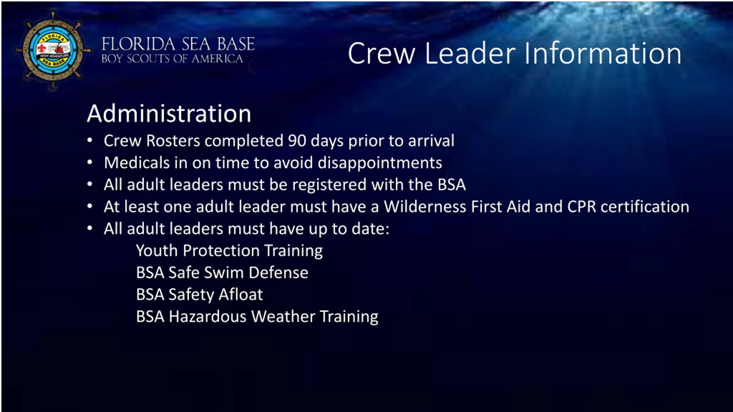 Crew Leader Information Administration Crew Rosters completed 90 days prior to arrival Medicals in on time to avoid disappointments All adult leaders must be registered with the BSA At least one adult leader must have a Wilderness First Aid and CPR certification All adult leaders must have up to date: Youth Protection Training BSA Safe Swim Defense BSA Safety Afloat BSA Hazardous Weather Training
