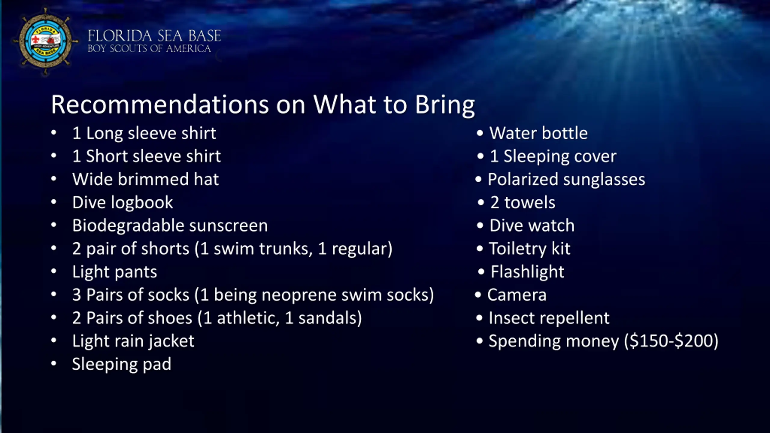 FAQs Recommendations on What to Bring 1 Long sleeve shirt Water bottle 1 Short sleeve shirt 1 Sleeping cover Wide brimmed hat Polarized sunglasses Dive logbook Biodegradable sunscreen Dive watch 2 pair of shorts (1 swim trunks, 1 regular) Toiletry kit Light pants Flashlight 3 Pairs of socks (1 being neoprene swim socks) Camera 2 Pairs of shoes (1 athletic, 1 sandals) Insect repellent Light rain jacket Spending money ($150-$200) Sleeping pad 2 towels