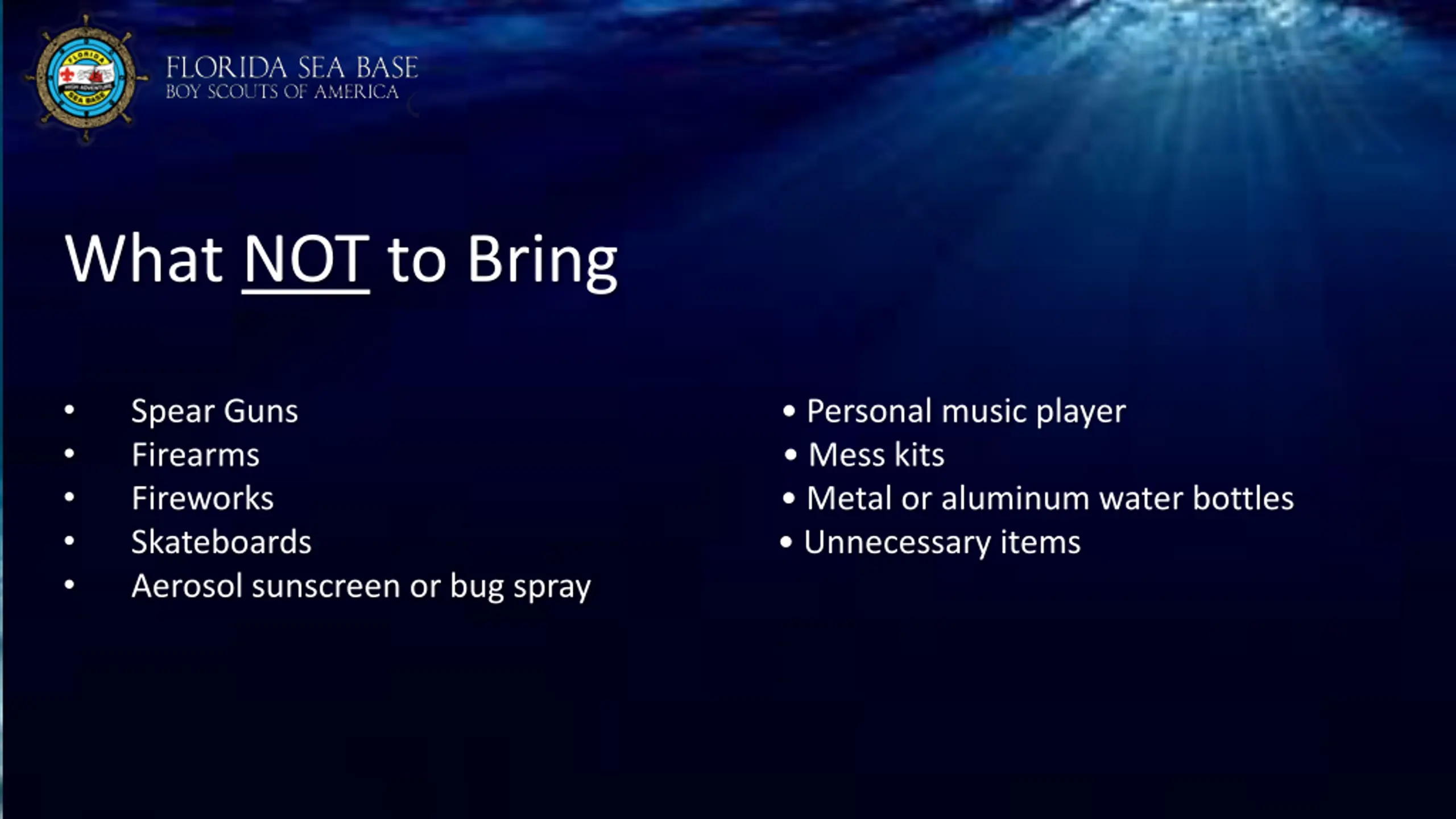 FAQs What NOT to Bring Spear Guns Personal music player Firearms Mess kits Fireworks Metal or aluminum water bottles Skateboards Unnecessary items Aerosol sunscreen or bug spray
