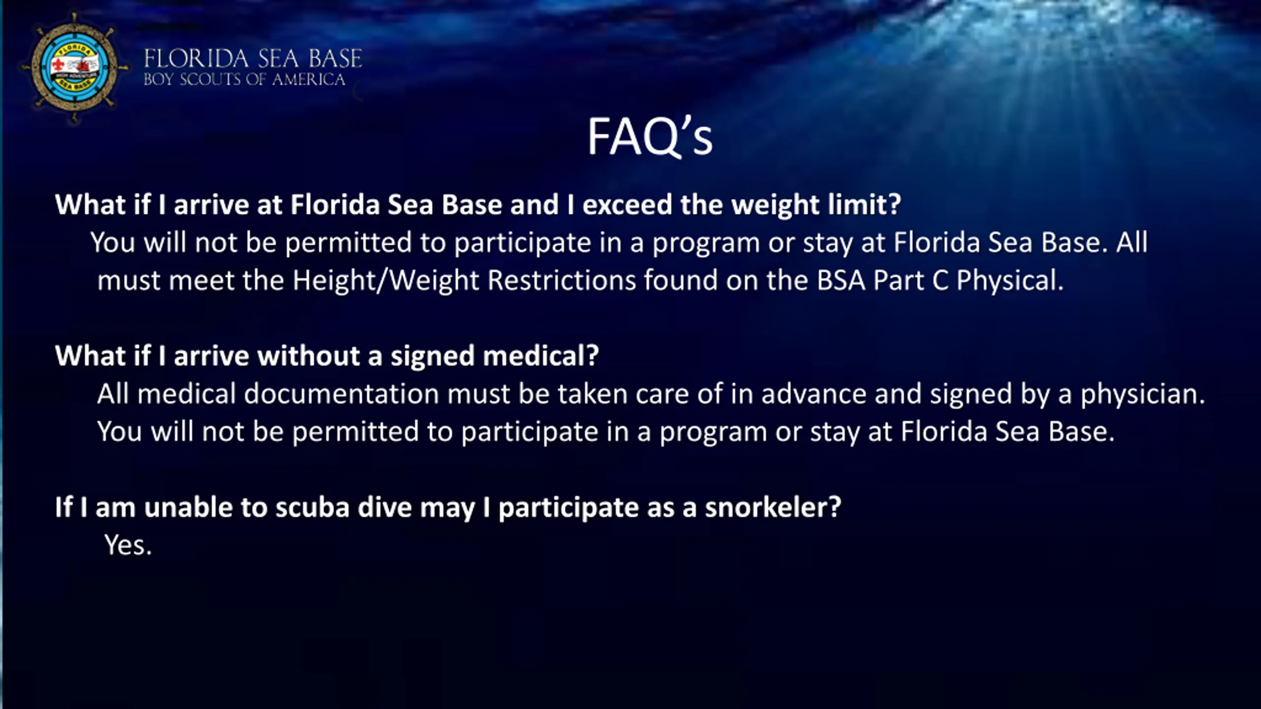 FAQs FAQ s What if I arrive at Florida Sea Base and I exceed the weight limit? You will not be permitted to participate in a program or stay at Florida Sea Base. All must meet the Height/Weight Restrictions found on the BSA Part C Physical. What if I arrive without a signed medical? All medical documentation must be taken care of in advance and signed by a physician. You will not be permitted to participate in a program or stay at Florida Sea Base. If I am unable to scuba dive may I participate as a snorkeler? Yes.