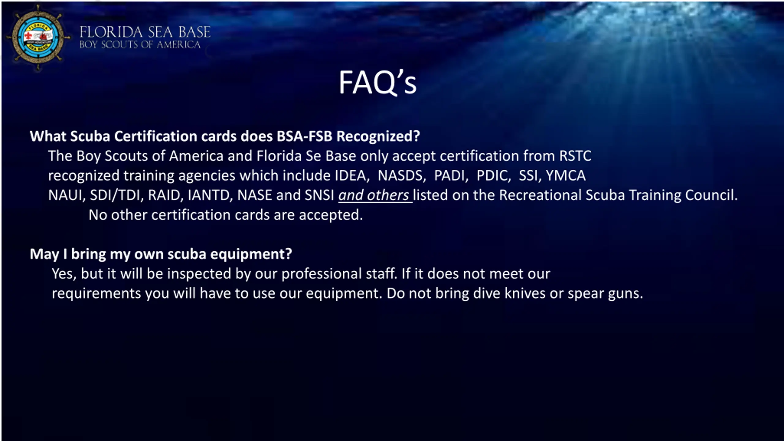 FAQs What Scuba Certification cards does BSA-FSB Recognized? The Boy Scouts of America and Florida Se Base only accept certification from RSTC recognized training agencies which include IDEA, NASDS, PADI, PDIC, SSI, YMCA NAUI, SDI/TDI, RAID, IANTD, NASE and SNSI and others listed on the Recreational Scuba Training Council. No other certification cards are accepted. May I bring my own scuba equipment? Yes, but it will be inspected by our professional staff. If it does not meet our requirements you will have to use our equipment. Do not bring dive knives or spear guns.