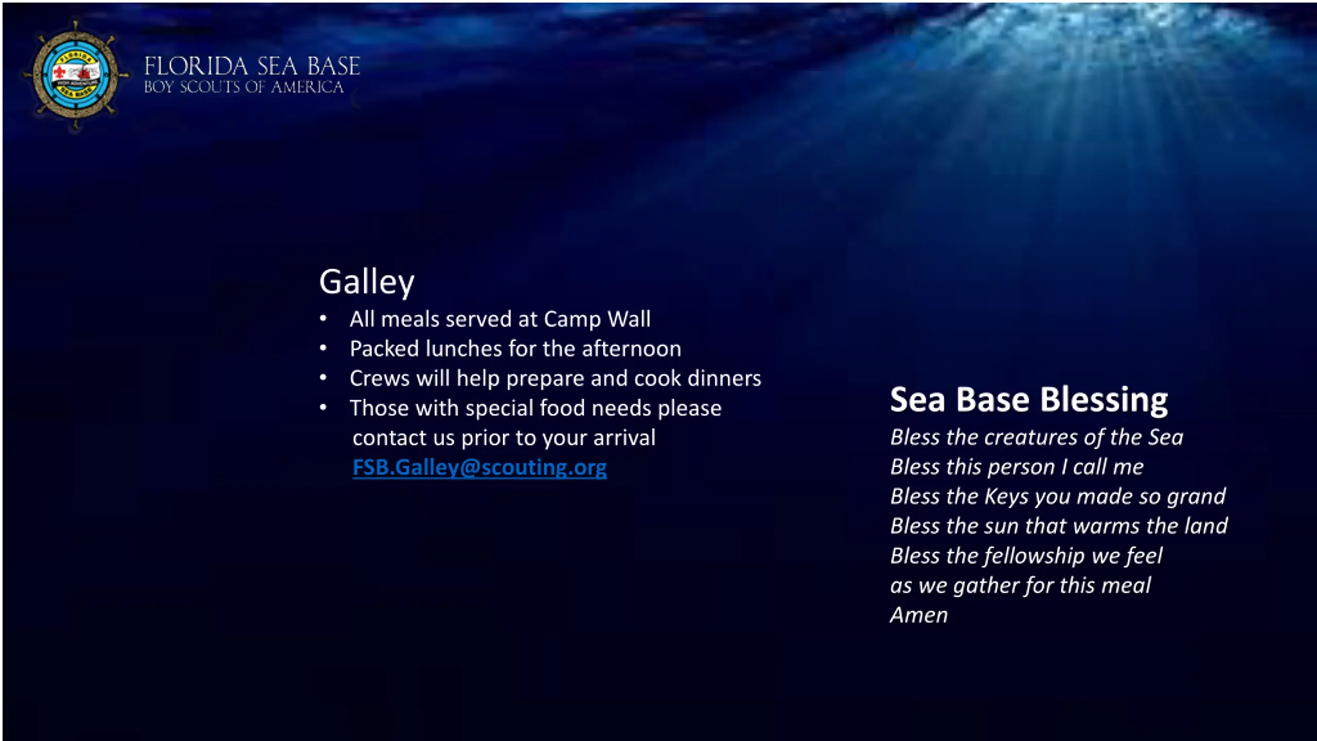 Galley All meals served at Camp Wall Packed lunches for the afternoon Crews will help prepare and cook dinners Those with special food needs please contact us prior to your arrival FSB.Galley@scouting.org Sea Base Blessing Bless the creatures of the Sea Bless this person I call me Bless the Keys you made so grand Bless the sun that warms the land Bless the fellowship we feel as we gather for this meal Amen