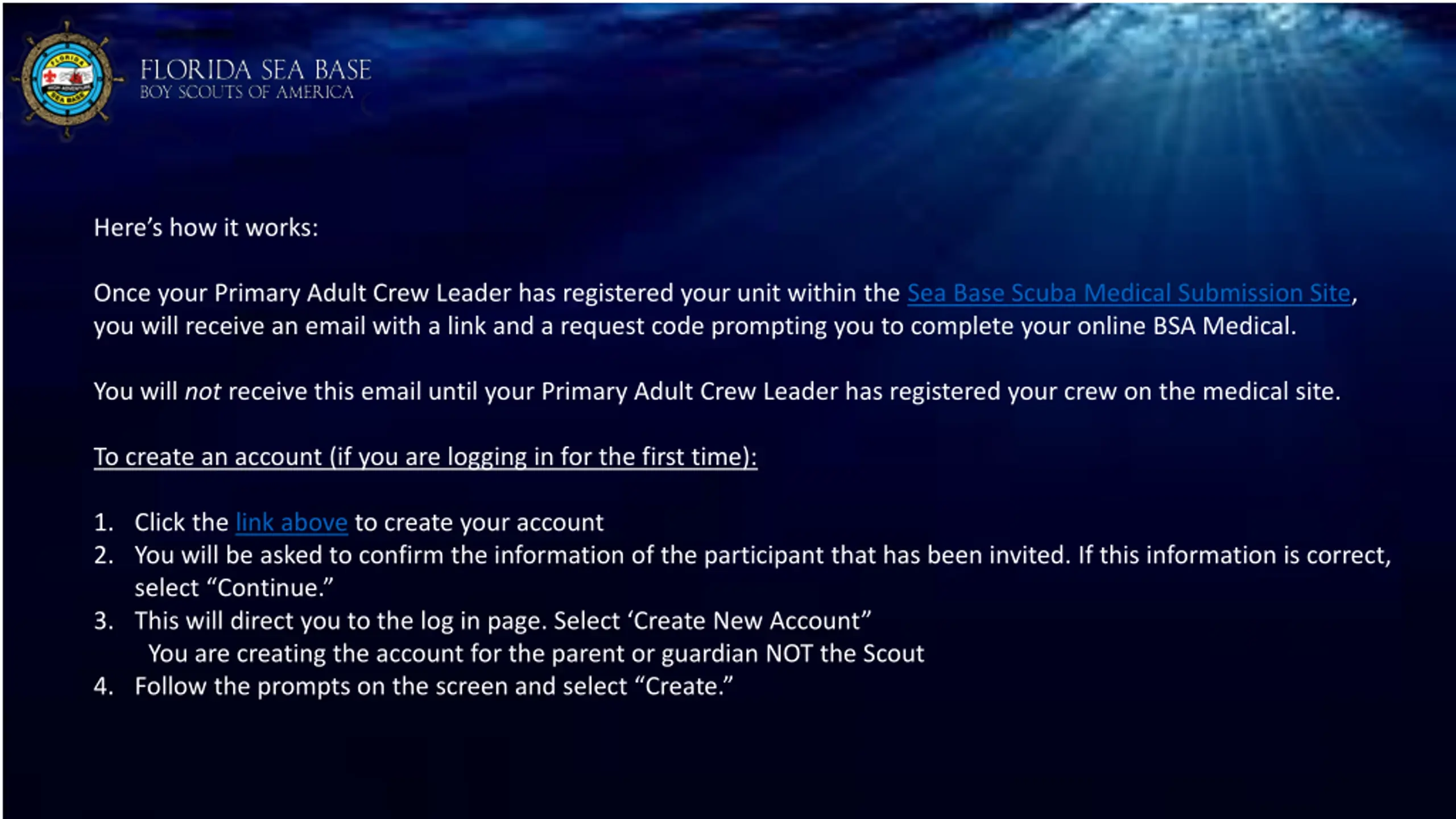 Heres how it works: Once your Primary Adult Crew Leader has registered your unit within the Sea Base Scuba Medical Submission Site, you will receive an email with a link and a request code prompting you to complete your online BSA Medical. You will not receive this email until your Primary Adult Crew Leader has registered your crew on the medical site. To create an account (if you are logging in for the first time): 1. Click the link above to create your account 2. You will be asked to confirm the information of the participant that has been invited. If this information is correct, select Continue. 3. This will direct you to the log in page. Select Create New Account You are creating the account for the parent or guardian NOT the Scout 4. Follow the prompts on the screen and select Create.