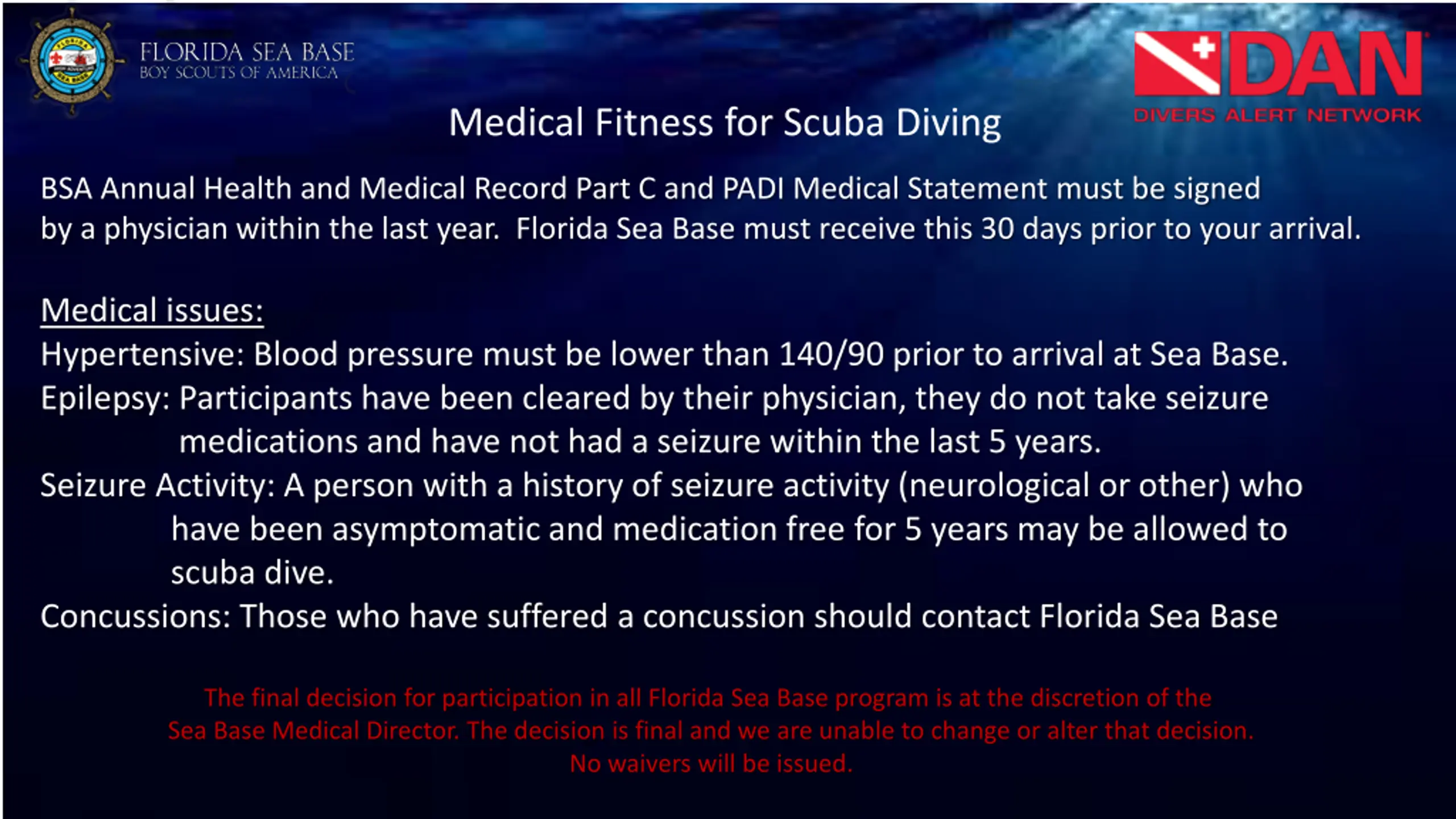 Medical Fitness for Scuba Diving BSA Annual Health and Medical Record Part C and PADI Medical Statement must be signed by a physician within the last year. Florida Sea Base must receive this 30 days prior to your arrival. Medical issues: Hypertensive: Blood pressure must be lower than 140/90 prior to arrival at Sea Base. Epilepsy: Participants have been cleared by their physician, they do not take seizure medications and have not had a seizure within the last 5 years. Seizure Activity: A person with a history of seizure activity (neurological or other) who have been asymptomatic and medication free for 5 years may be allowed to scuba dive. Concussions: Those who have suffered a concussion should contact Florida Sea Base The final decision for participation in all Florida Sea Base program is at the discretion of the Sea Base Medical Director. The decision is final and we are unable to change or alter that decision. No waivers will be issued.