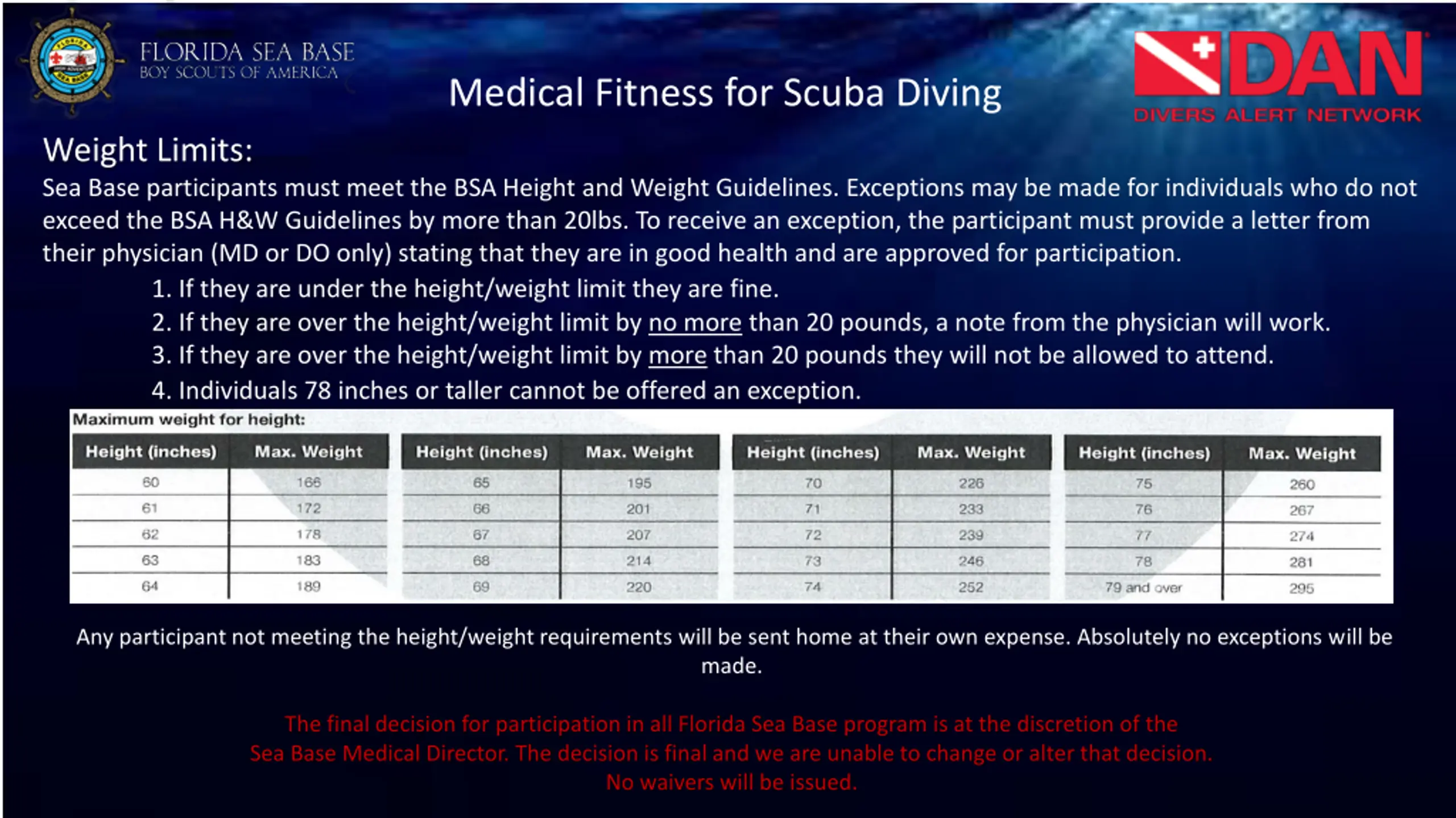 Medical Fitness for Scuba Diving Weight Limits: Sea Base participants must meet the BSA Height and Weight Guidelines. Exceptions may be made for individuals who do not exceed the BSA H&W Guidelines by more than 20lbs. To receive an exception, the participant must provide a letter from their physician (MD or DO only) stating that they are in good health and are approved for participation. 1. If they are under the height/weight limit they are fine. 2. If they are over the height/weight limit by no more than 20 pounds, a note from the physician will work. 3. If they are over the height/weight limit by more than 20 pounds they will not be allowed to attend. 4. Individuals 78 inches or taller cannot be offered an exception. Any participant not meeting the height/weight requirements will be sent home at their own expense. Absolutely no exceptions will be made. The final decision for participation in all Florida Sea Base program is at the discretion of the Sea Base Medical Director. The decision is final and we are unable to change or alter that decision. No waivers will be issued.