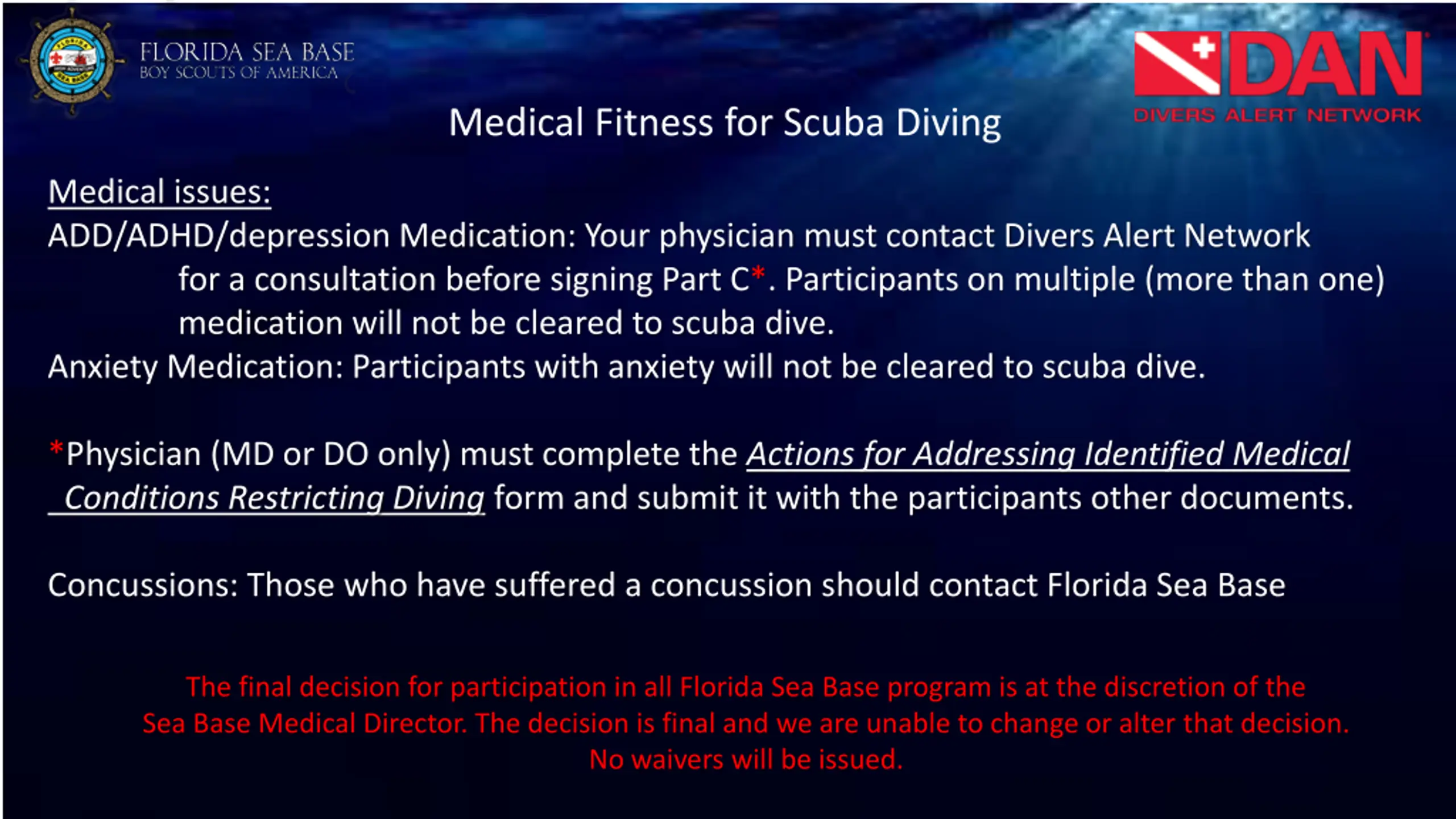 Medical Fitness for Scuba Diving Medical issues: ADD/ADHD/depression Medication: Your physician must contact Divers Alert Network for a consultation before signing Part C*. Participants on multiple (more than one) medication will not be cleared to scuba dive. Anxiety Medication: Participants with anxiety will not be cleared to scuba dive. *Physician (MD or DO only) must complete the Actions for Addressing Identified Medical Conditions Restricting Diving form and submit it with the participants other documents. Concussions: Those who have suffered a concussion should contact Florida Sea Base The final decision for participation in all Florida Sea Base program is at the discretion of the Sea Base Medical Director. The decision is final and we are unable to change or alter that decision. No waivers will be issued.