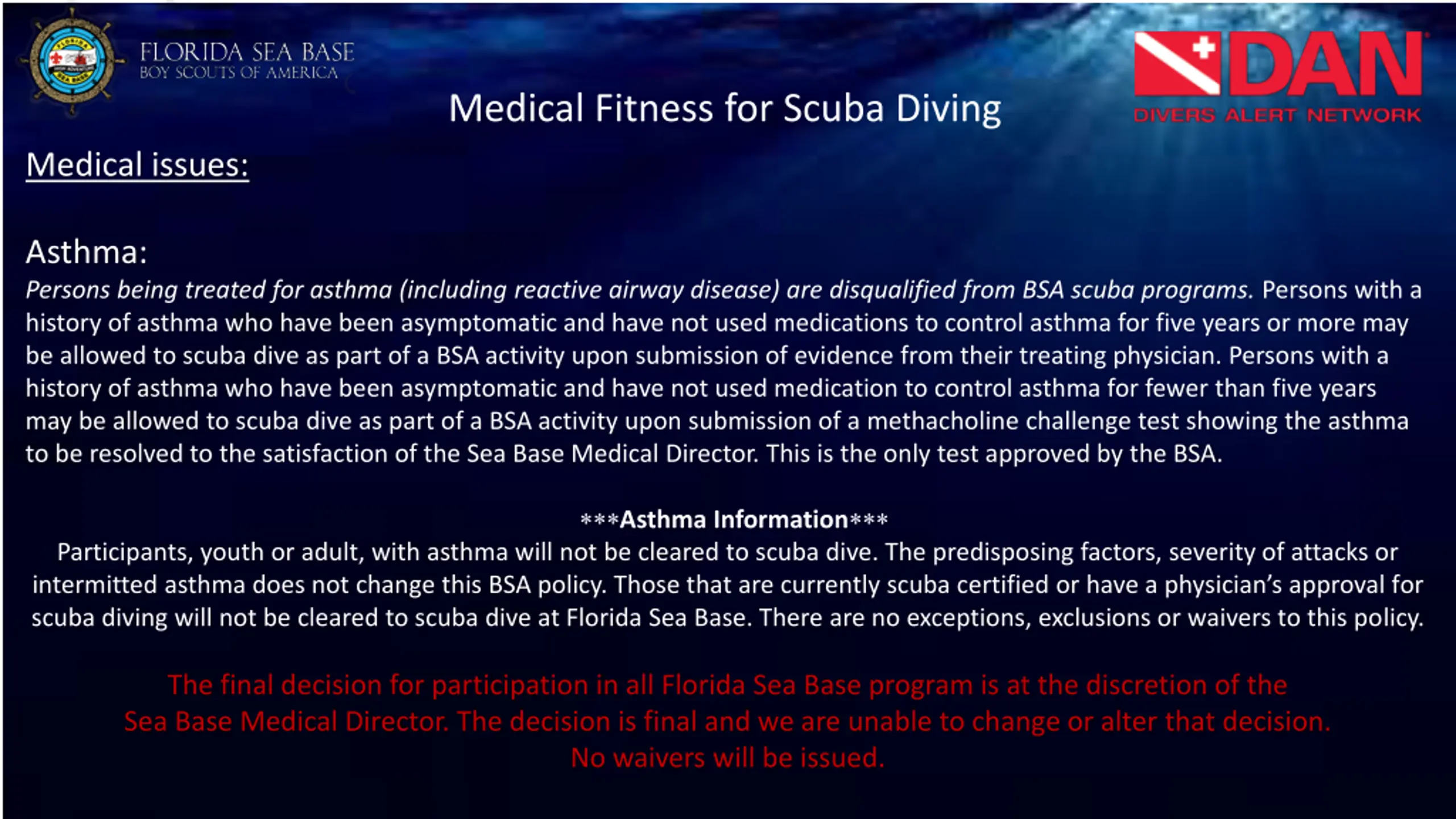 Medical Fitness for Scuba Diving Medical issues: Asthma: Persons being treated for asthma (including reactive airway disease) are disqualified from BSA scuba programs. Persons with a history of asthma who have been asymptomatic and have not used medications to control asthma for five years or more may be allowed to scuba dive as part of a BSA activity upon submission of evidence from their treating physician. Persons with a history of asthma who have been asymptomatic and have not used medication to control asthma for fewer than five years may be allowed to scuba dive as part of a BSA activity upon submission of a methacholine challenge test showing the asthma to be resolved to the satisfaction of the Sea Base Medical Director. This is the only test approved by the BSA. Asthma Information Participants, youth or adult, with asthma will not be cleared to scuba dive. The predisposing factors, severity of attacks or intermitted asthma does not change this BSA policy. Those that are currently scuba certified or have a physician s approval for scuba diving will not be cleared to scuba dive at Florida Sea Base. There are no exceptions, exclusions or waivers to this policy. The final decision for participation in all Florida Sea Base program is at the discretion of the Sea Base Medical Director. The decision is final and we are unable to change or alter that decision. No waivers will be issued.