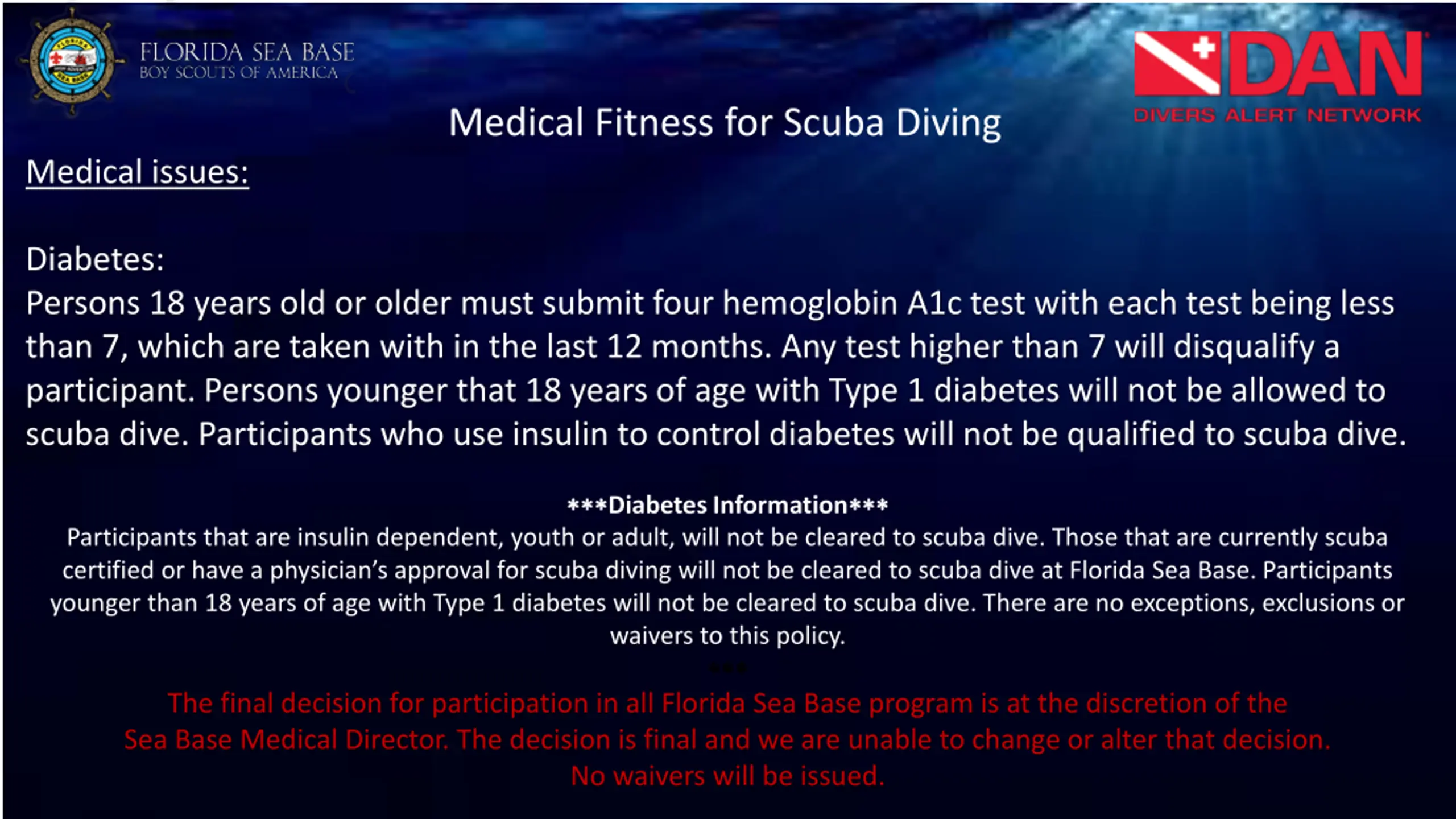 Medical Fitness for Scuba Diving Medical issues: Diabetes: Persons 18 years old or older must submit four hemoglobin A1c test with each test being less than 7, which are taken with in the last 12 months. Any test higher than 7 will disqualify a participant. Persons younger that 18 years of age with Type 1 diabetes will not be allowed to scuba dive. Participants who use insulin to control diabetes will not be qualified to scuba dive. Diabetes Information Participants that are insulin dependent, youth or adult, will not be cleared to scuba dive. Those that are currently scuba certified or have a physician s approval for scuba diving will not be cleared to scuba dive at Florida Sea Base. Participants younger than 18 years of age with Type 1 diabetes will not be cleared to scuba dive. There are no exceptions, exclusions or waivers to this policy. The final decision for participation in all Florida Sea Base program is at the discretion of the Sea Base Medical Director. The decision is final and we are unable to change or alter that decision. No waivers will be issued.