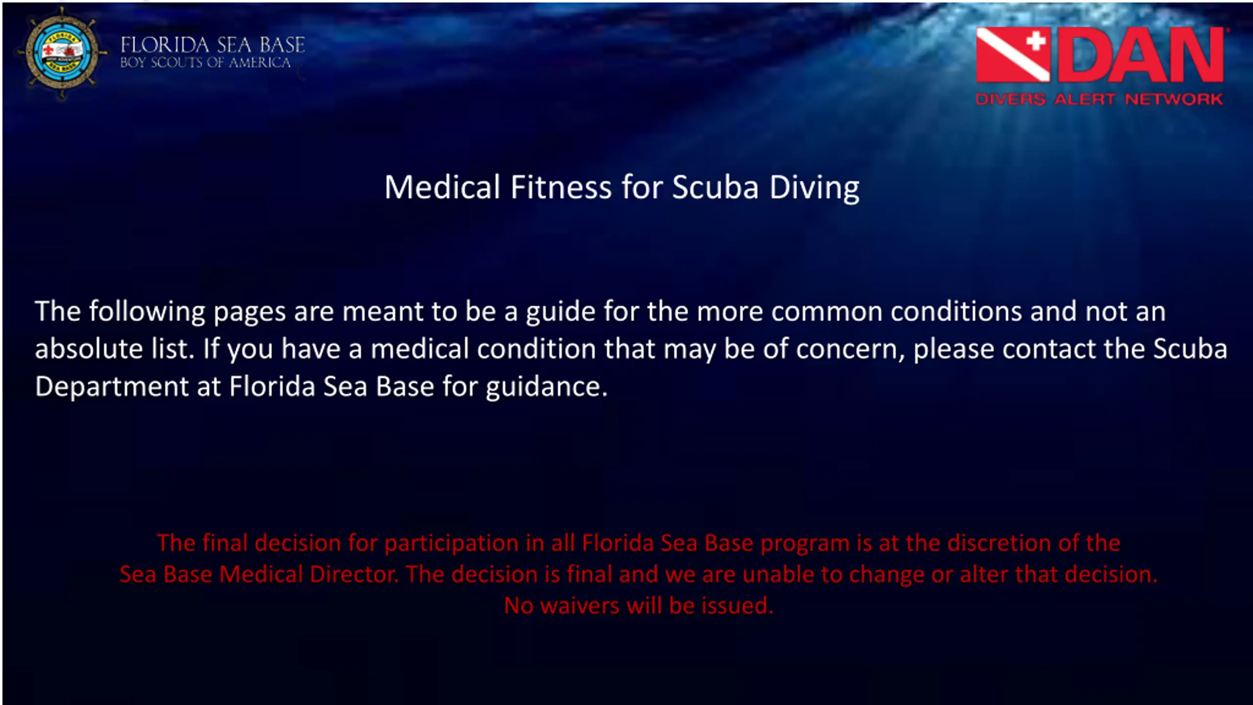 Medical Fitness for Scuba Diving The following pages are meant to be a guide for the more common conditions and not an absolute list. If you have a medical condition that may be of concern, please contact the Scuba Department at Florida Sea Base for guidance. The final decision for participation in all Florida Sea Base program is at the discretion of the Sea Base Medical Director. The decision is final and we are unable to change or alter that decision. No waivers will be issued.