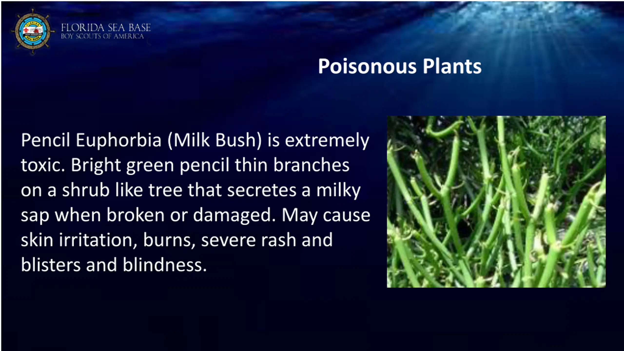 Poisonous Plants Pencil Euphorbia (Milk Bush) is extremely toxic. Bright green pencil thin branches on a shrub like tree that secretes a milky sap when broken or damaged. May cause skin irritation, burns, severe rash and blisters and blindness.