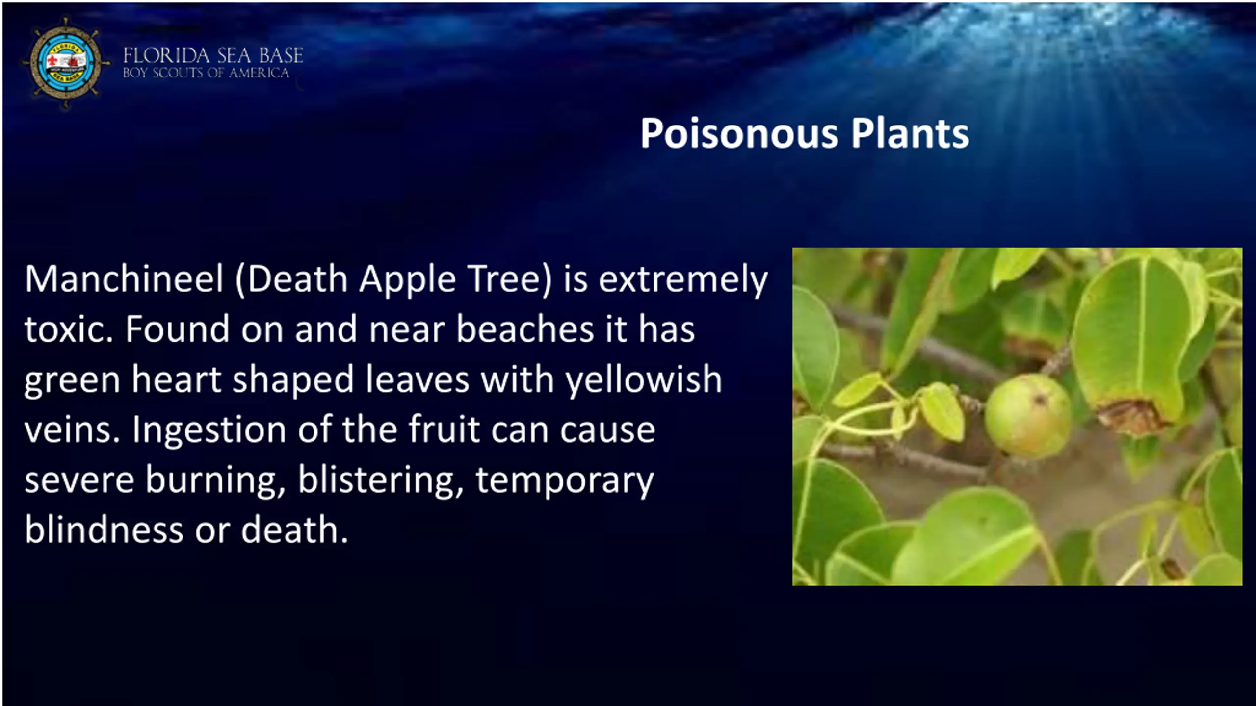 Poisonous Plants Manchineel (Death Apple Tree) is extremely toxic. Found on and near beaches it has green heart shaped leaves with yellowish veins. Ingestion of the fruit can cause severe burning, blistering, temporary blindness or death.