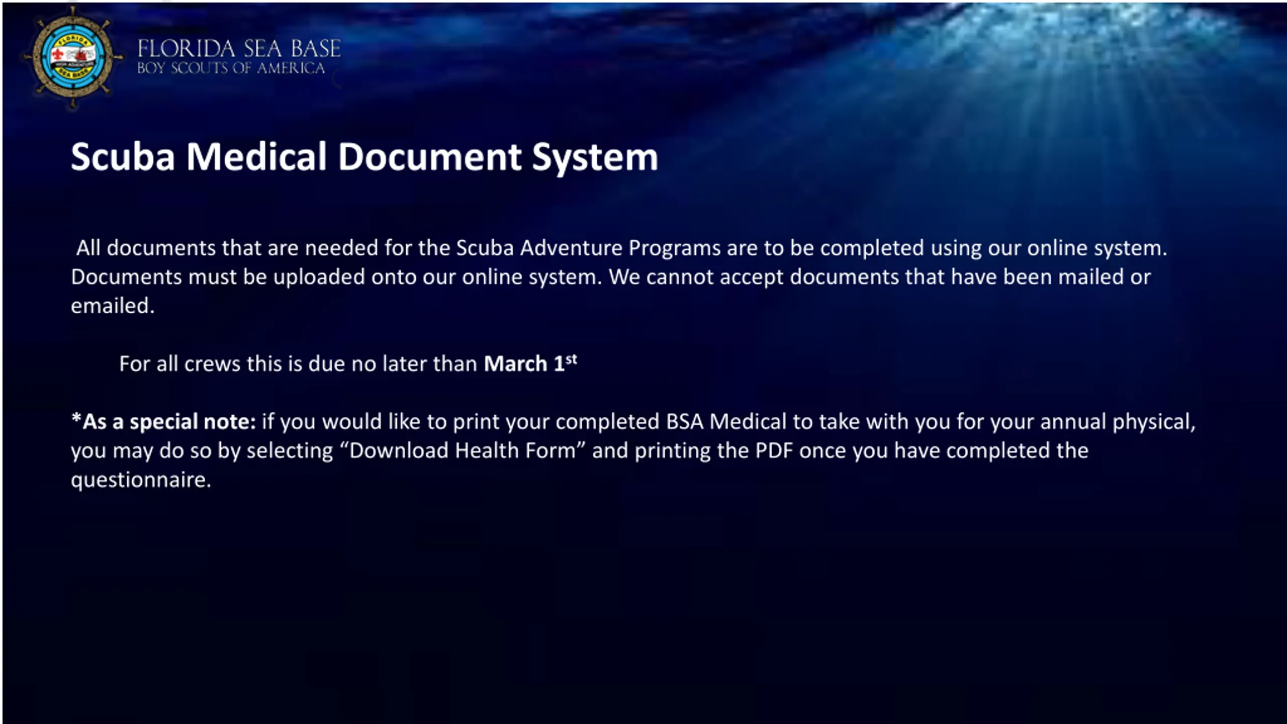 Scuba Medical Document System All documents that are needed for the Scuba Adventure Programs are to be completed using our online system. Documents must be uploaded onto our online system. We cannot accept documents that have been mailed or emailed. For all crews this is due no later than March 1st *As a special note: if you would like to print your completed BSA Medical to take with you for your annual physical, you may do so by selecting Download Health Form and printing the PDF once you have completed the questionnaire.