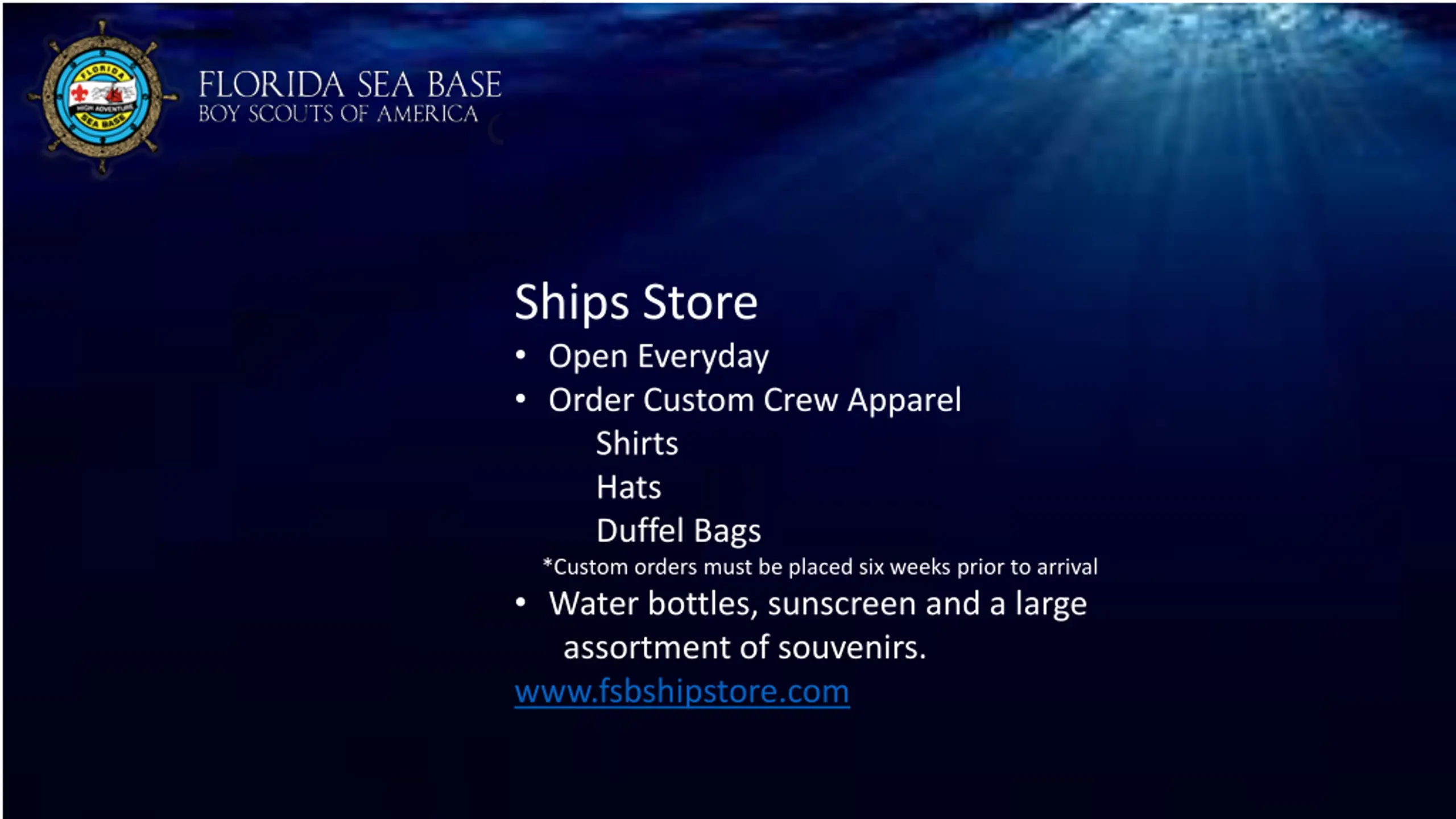 Ships Store Open Everyday Order Custom Crew Apparel Shirts Hats Duffel Bags *Custom orders must be placed six weeks prior to arrival Water bottles, sunscreen and a large assortment of souvenirs. www.fsbshipstore.com