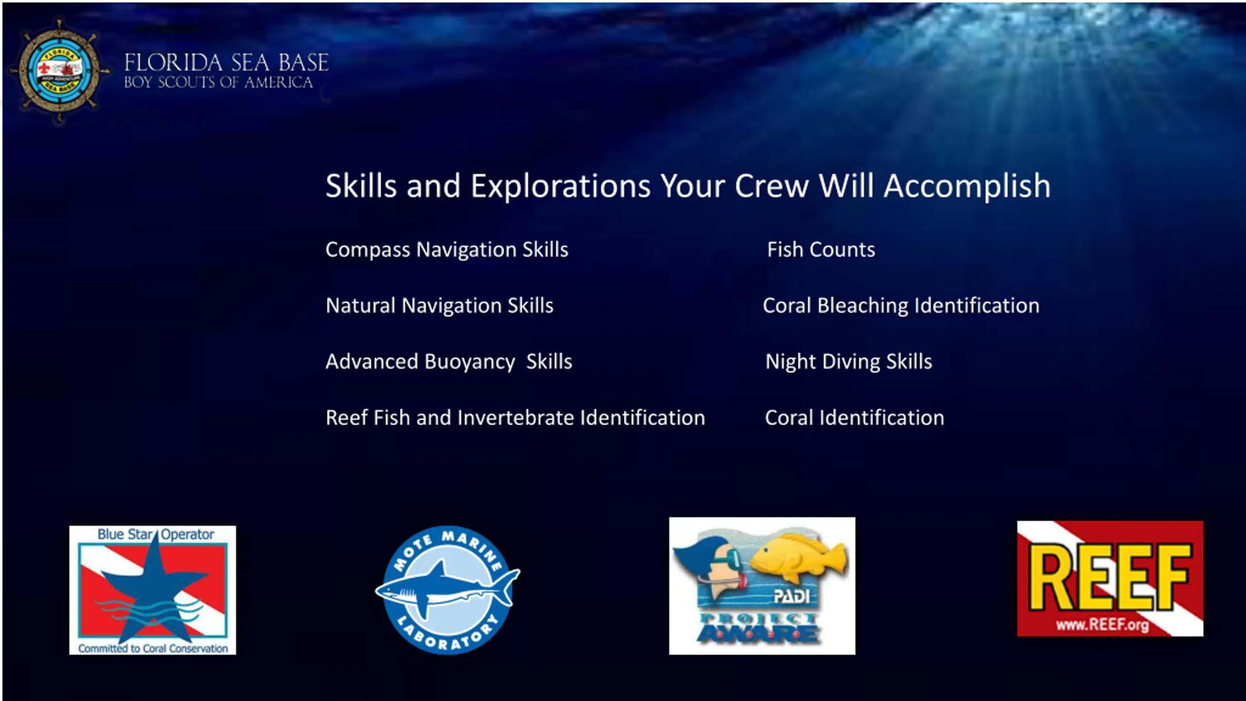 Skills and Explorations Your Crew Will Accomplish Compass Navigation Skills Fish Counts Natural Navigation Skills Coral Bleaching Identification Advanced Buoyancy Skills Night Diving Skills Reef Fish and Invertebrate Identification Coral Identification